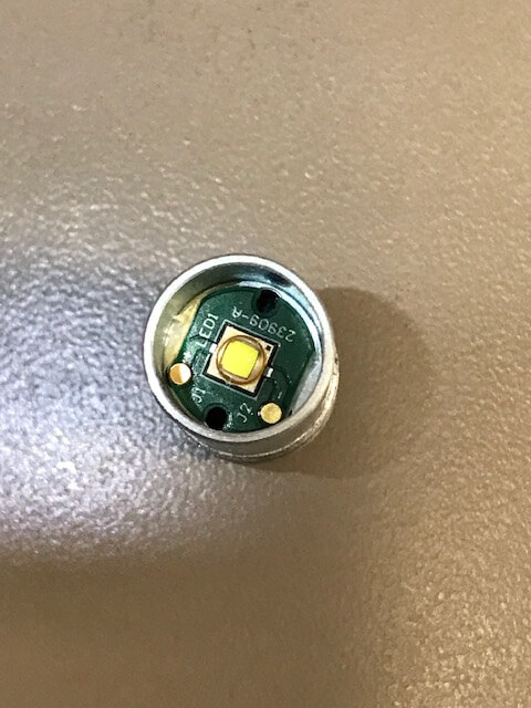 In this light is a Cree XP-G2. Appears to be cool white. There’s a reflector in this tiny light. I don’t know that it’s specified, but it looks like a small Ledil Boom reflector.