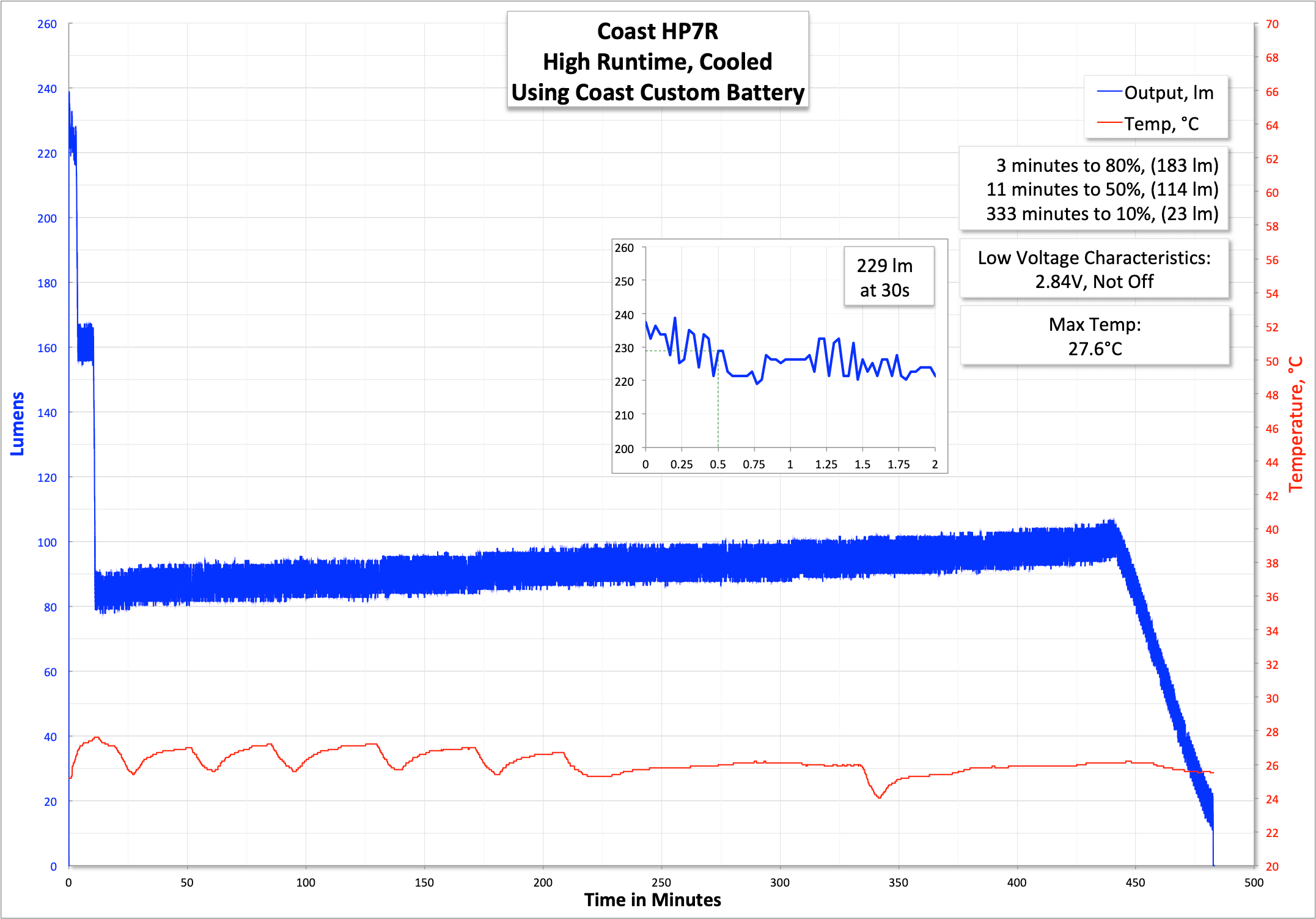 I tested only one runtime, and that was with the rechargeable battery pack. The output didn’t hit the specification and had a couple of stepdowns. The HP7R just ran and ran and ran at the lower output of around 90 lumens.