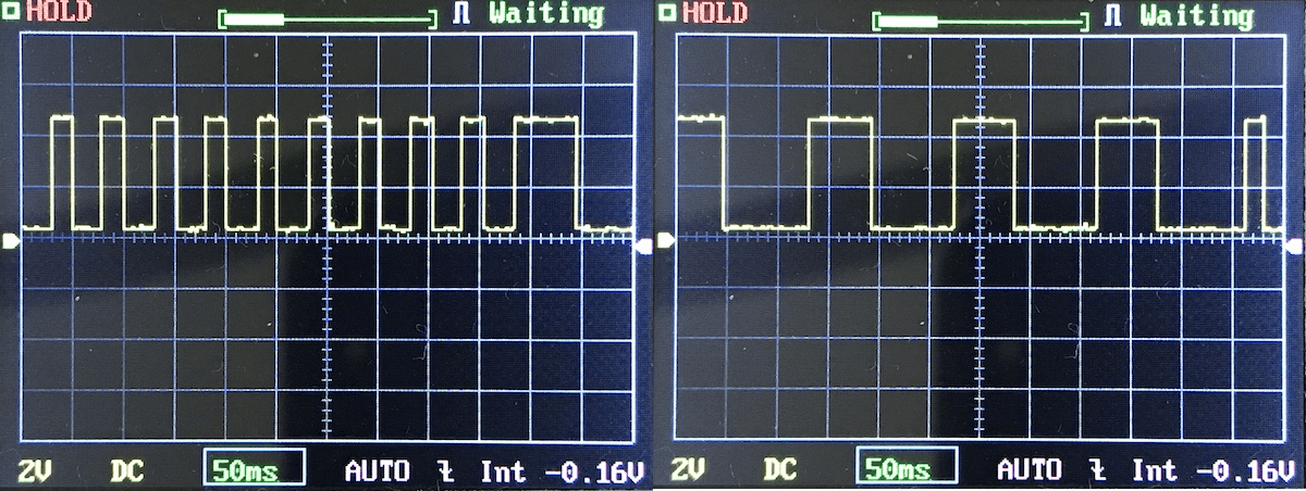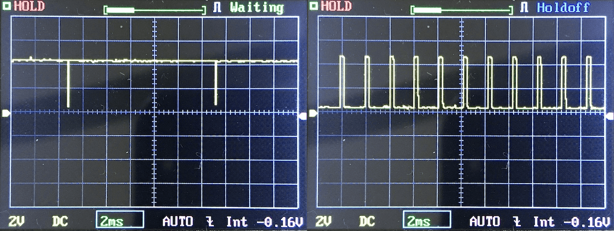 Then there’s the Ultrafire WF-602C flashlight, which has some of the worst PWM I’ve seen. It’s so bad that I used a post about it to explain PWM! Here are multiple timescales (10ms, 5ms, 2ms, 1ms, 0.5ms, 0.2ms) to make comparing this “worst” PWM light to the test light easier. That post also explains why I didn’t test the WF-602C at the usual 50us scale.