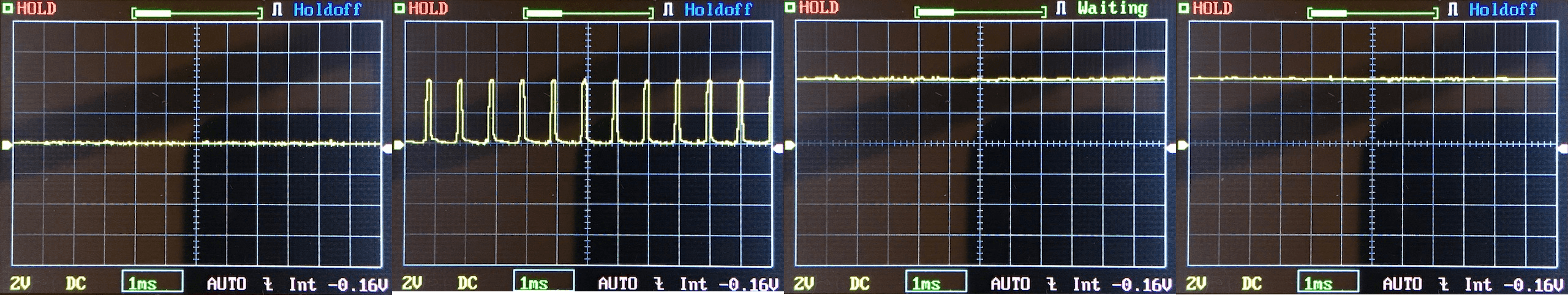 Then there’s the Ultrafire WF-602C flashlight, which has some of the worst PWM I’ve seen. It’s so bad that I used a post about it to explain PWM! Here are multiple timescales (10ms, 5ms, 2ms, 1ms, 0.5ms, 0.2ms) to make comparing this “worst” PWM light to the test light easier. That post also explains why I didn’t test the WF-602C at the usual 50us scale.