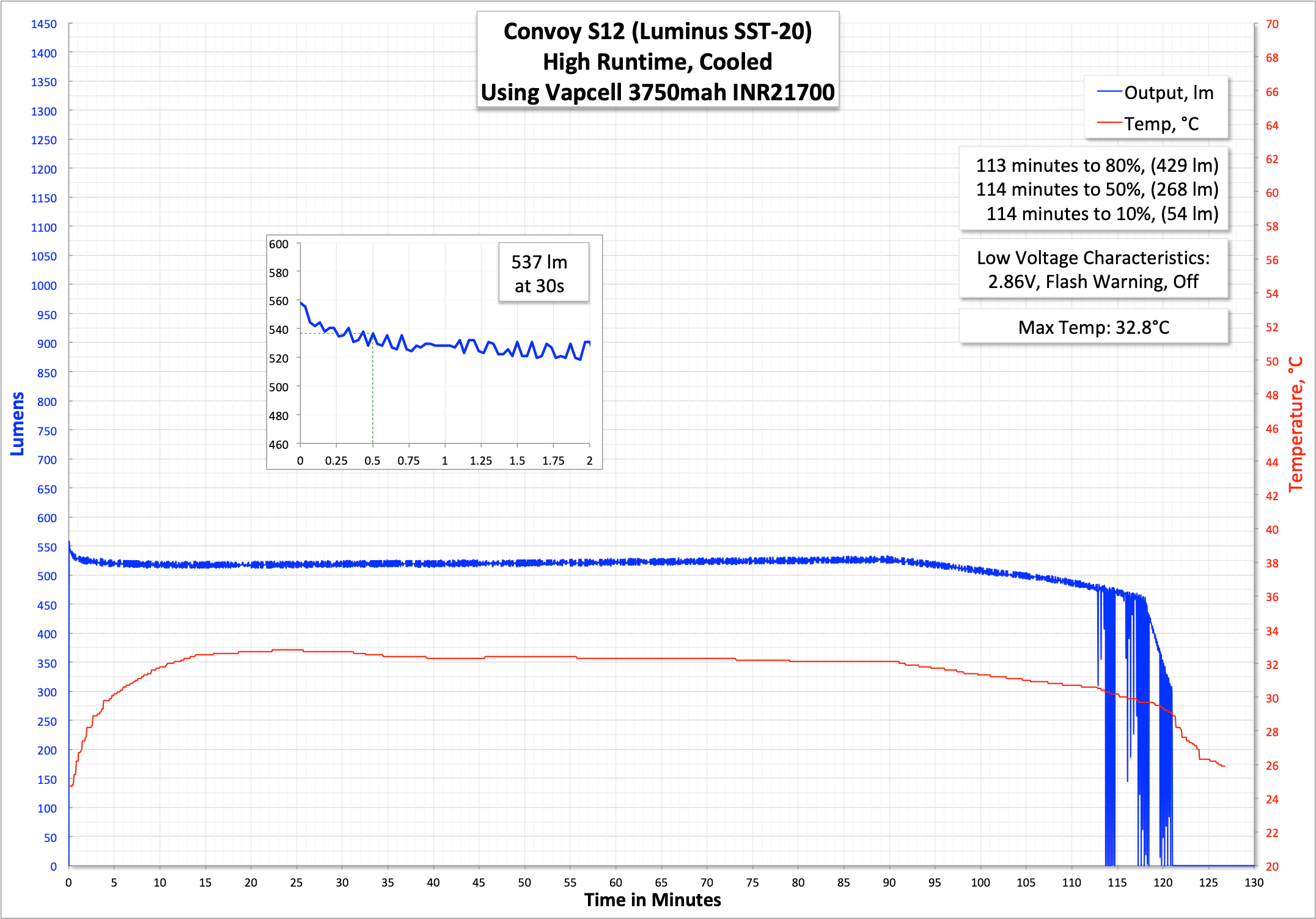 You’ll likely want a fairly high-quality cell because the S12 draws around 5A on 100% output. Here’s a runtime on 100%. Basically, the light starts at 100% and then tracks down just a little before settling out at around 1000 lumens. After that, the output falls as the cell voltage falls. The emitter flashes to alert to low voltage at around 3V. This flash is noticeable and quite dramatic because at this point, the output can still be as high as 700 lumens. So a flash from 700 lumens to off for a second is quite noticeable. And the light does eventually shut off, at around 2.85V.