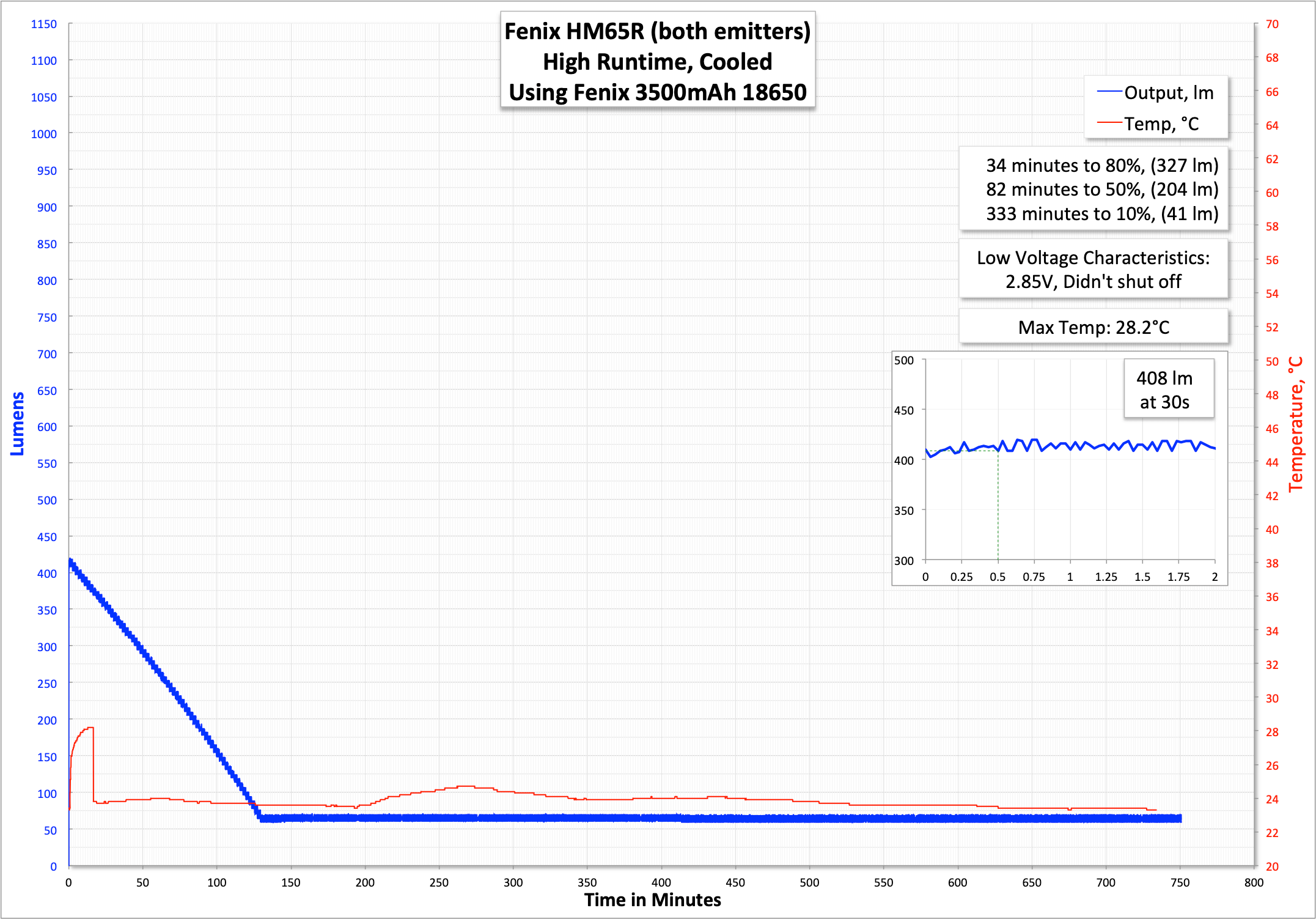 There’s really only one “short” runtime, and that’s the highest output of the throwy emitter. It’s claimed to be 2 hours, and that seems to be for only the throw. I performed a runtime with both running in their highest mode. Even then, the output falls quite short of the 1000-lumen claim. (The 1000 lumen claim is for just the throw emitter; I measured 974 total, using both emitters, which should be 1400 lumens total.) Temperature faulted during this (and the other) run, but it was at a point when the temperature had already settled anyway.