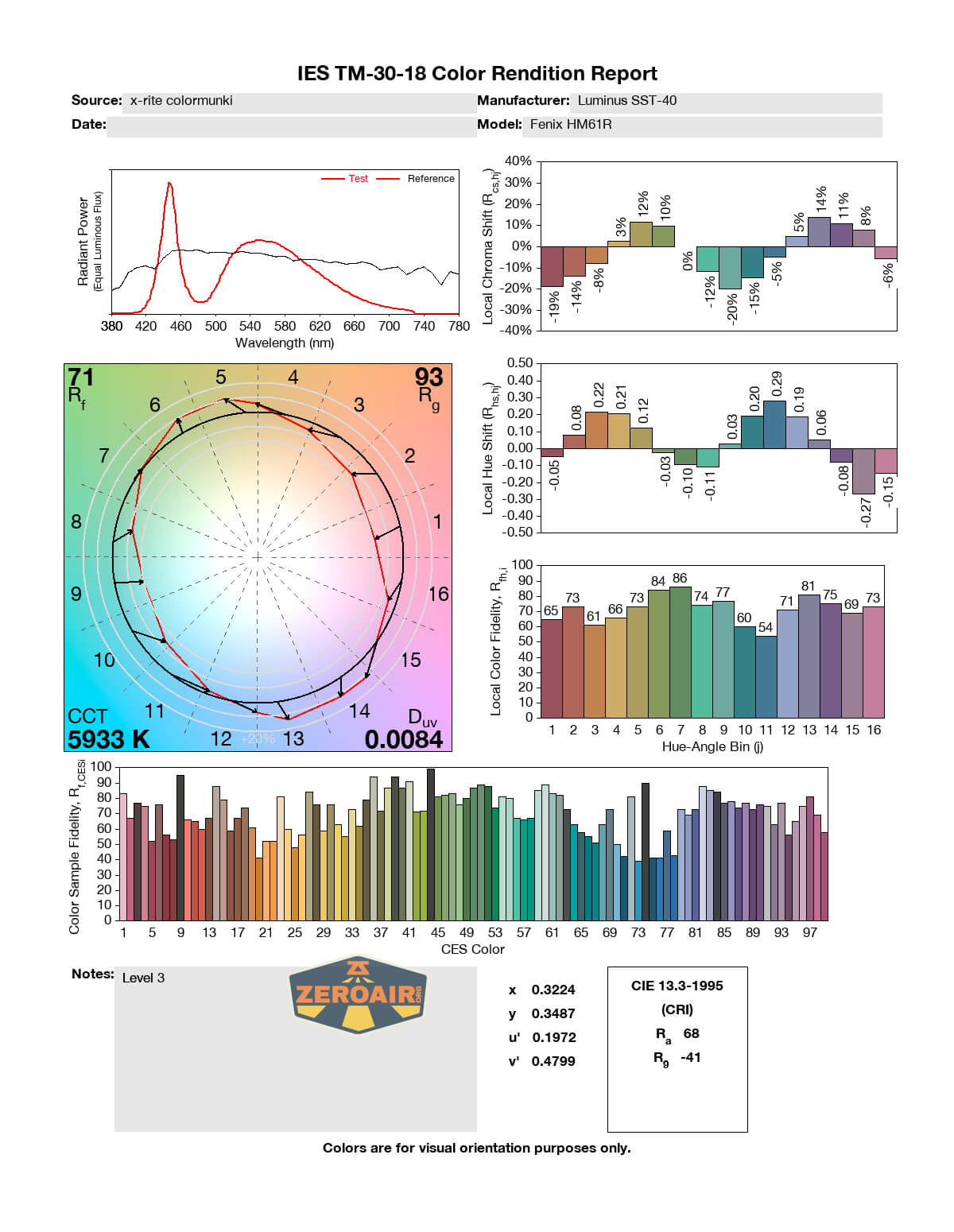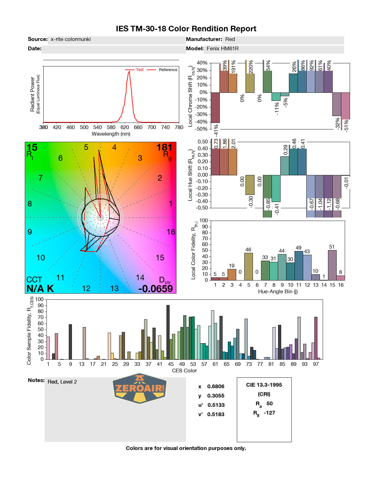 Here are the CRI and CCT reports for all the white modes and also two red modes. The CCT hits around 6000K while the CRI is relatively low, at 68 or so.
