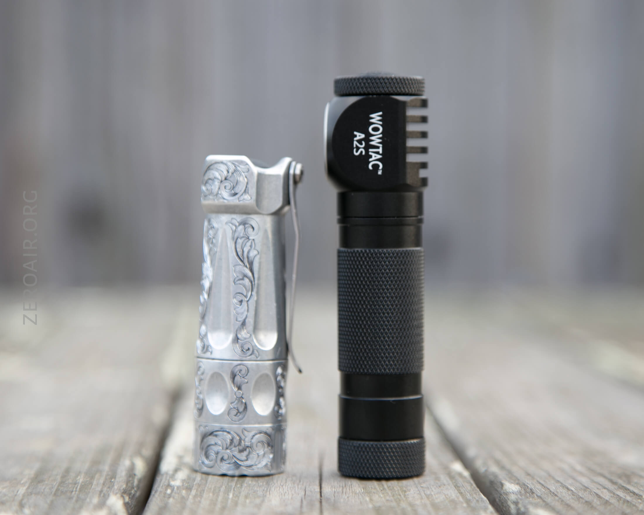And here’s the light beside my custom-engraved TorchLAB BOSS 35, an 18350 light. I reviewed the aluminum version of that light in both 35 and 70 formats.