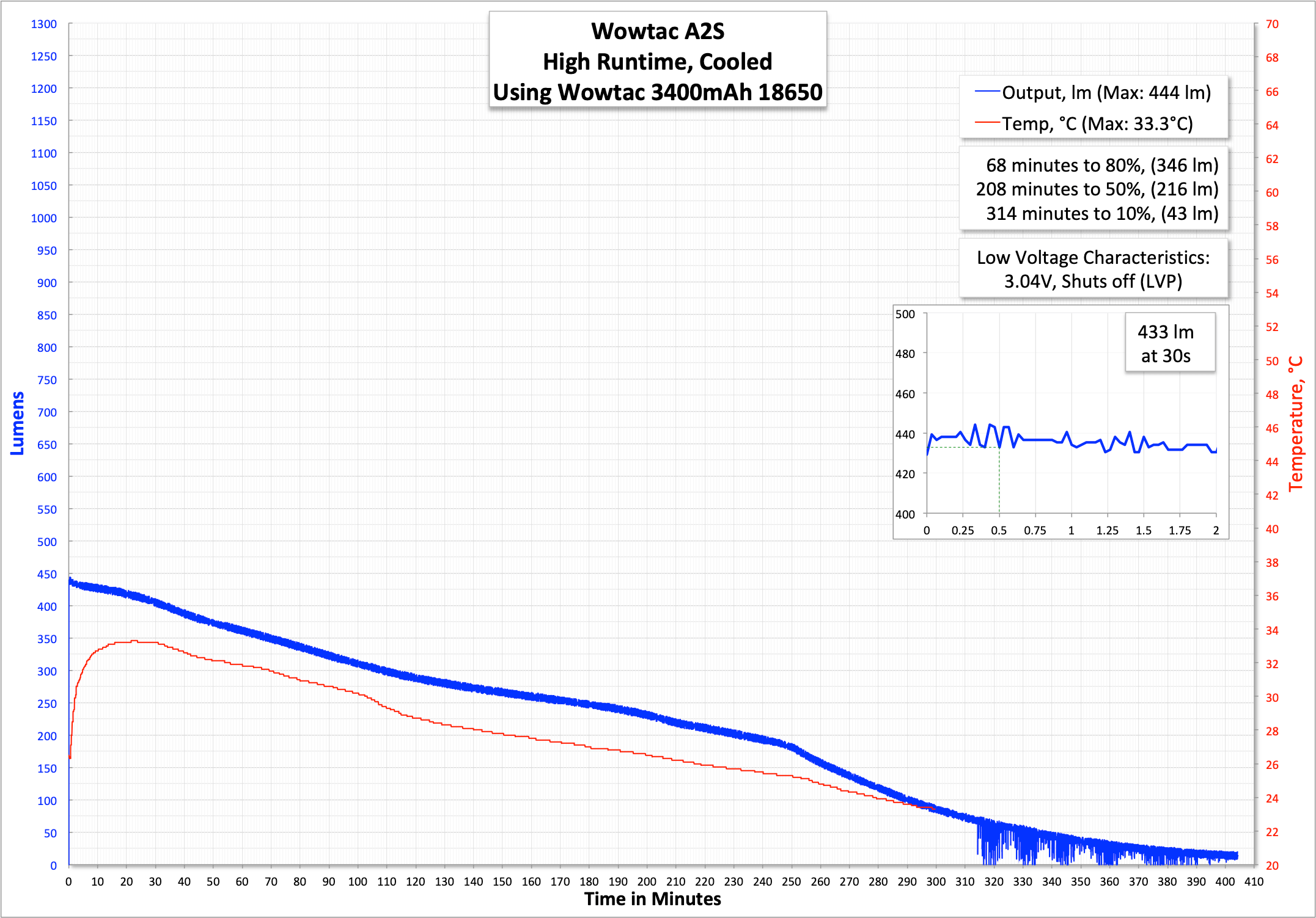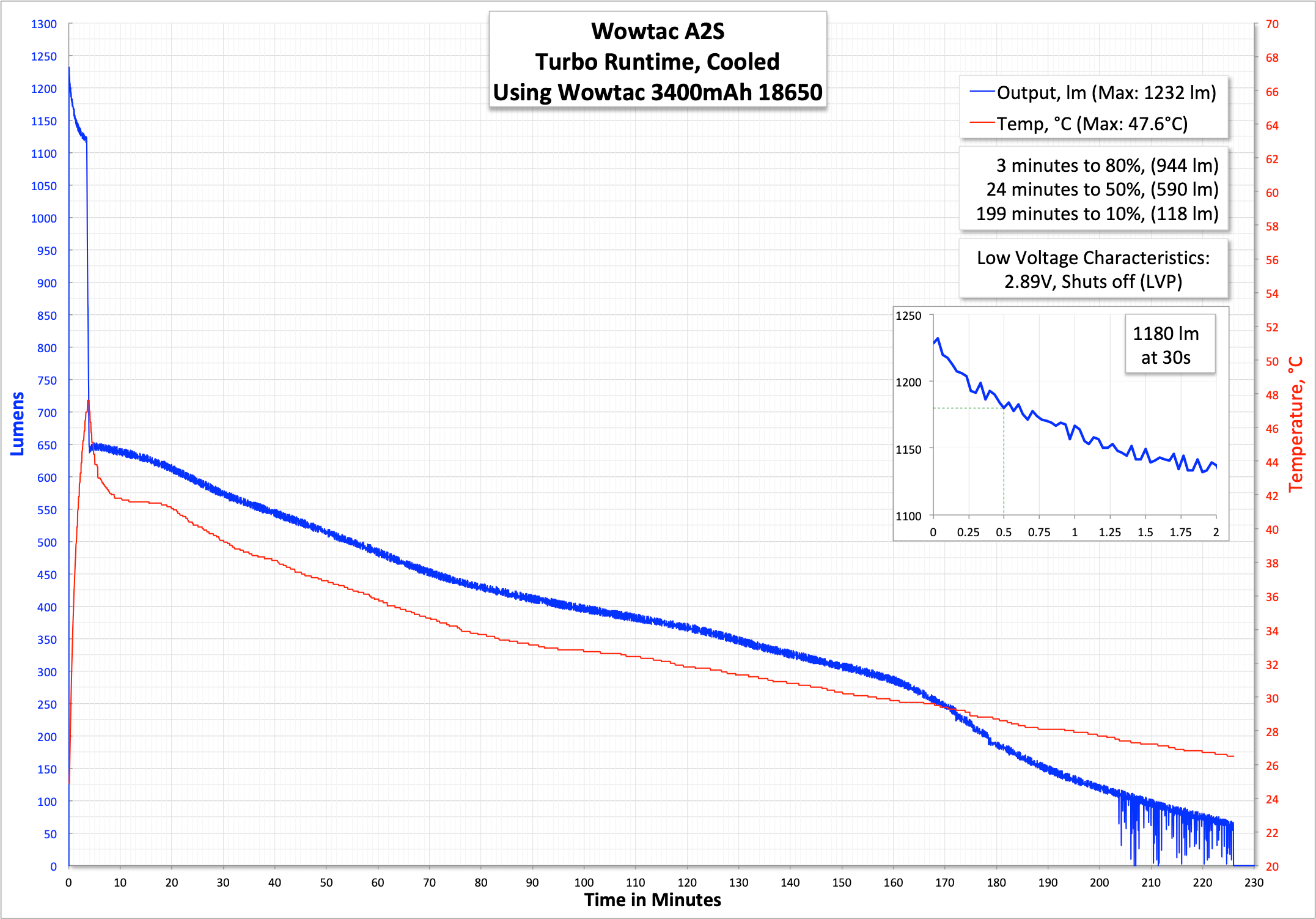 Here’s a runtime on Turbo. Output beats the claim by a fair margin in my test. The light steps down after a short (but respectable) while, and then finally ends with a warning from the main emitter (two flashes).