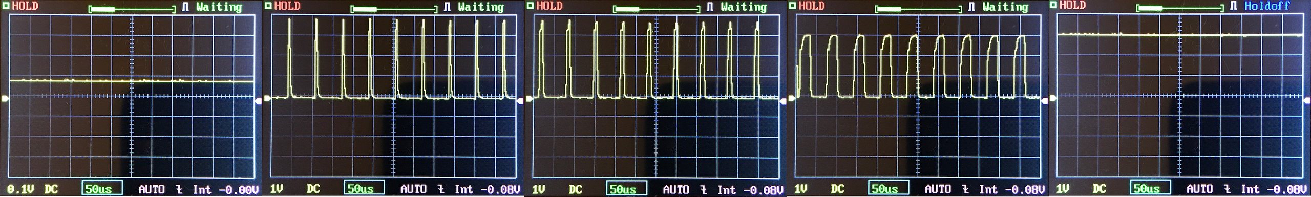 Then there’s the Ultrafire WF-602C flashlight, which has some of the worst PWM I’ve seen. It’s so bad that I used a post about it to explain PWM! Here are multiple timescales (10ms, 5ms, 2ms, 1ms, 0.5ms, 0.2ms) to make comparing this “worst” PWM light to the test light easier. That post also explains why I didn’t test the WF-602C at the usual 50us scale.