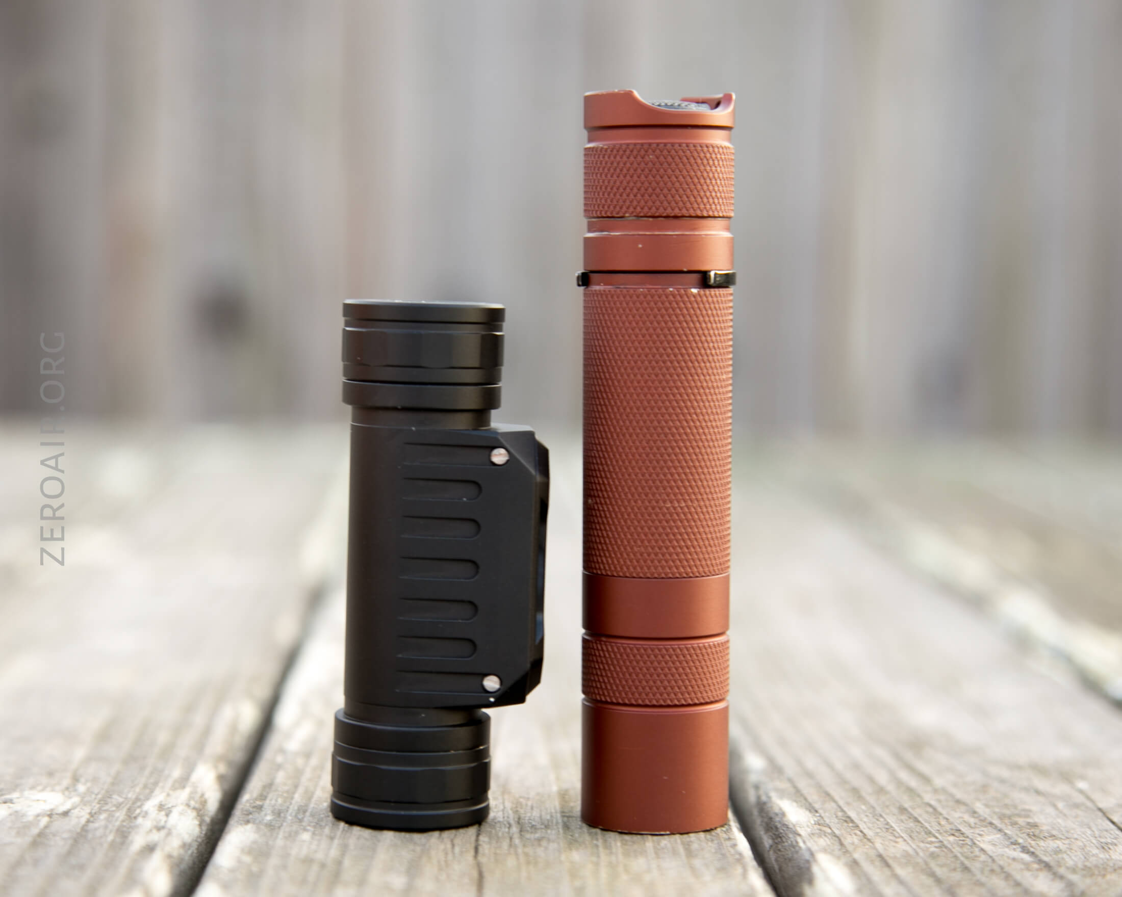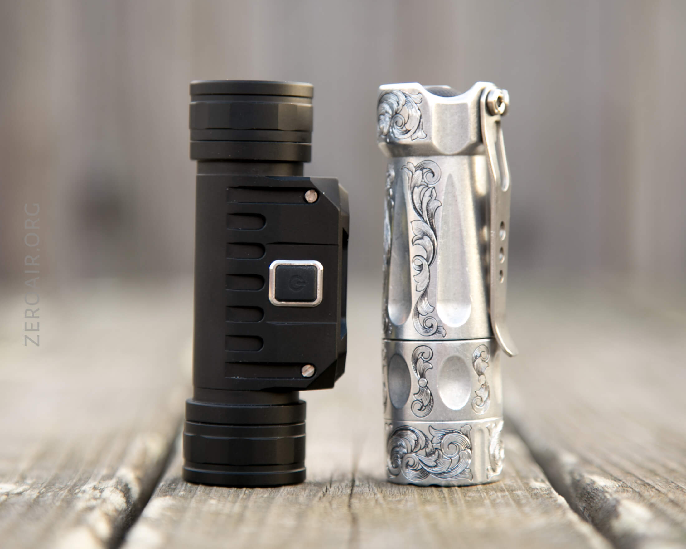 And here’s the light beside my custom-engraved TorchLAB BOSS 35, an 18350 light. I reviewed the aluminum version of that light in both 35 and 70 formats. To be honest, barely bigger than the 18350 TorchLAB BOSS. (!!!)
