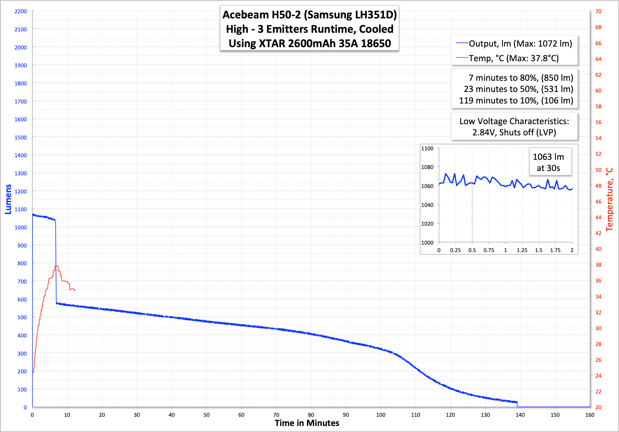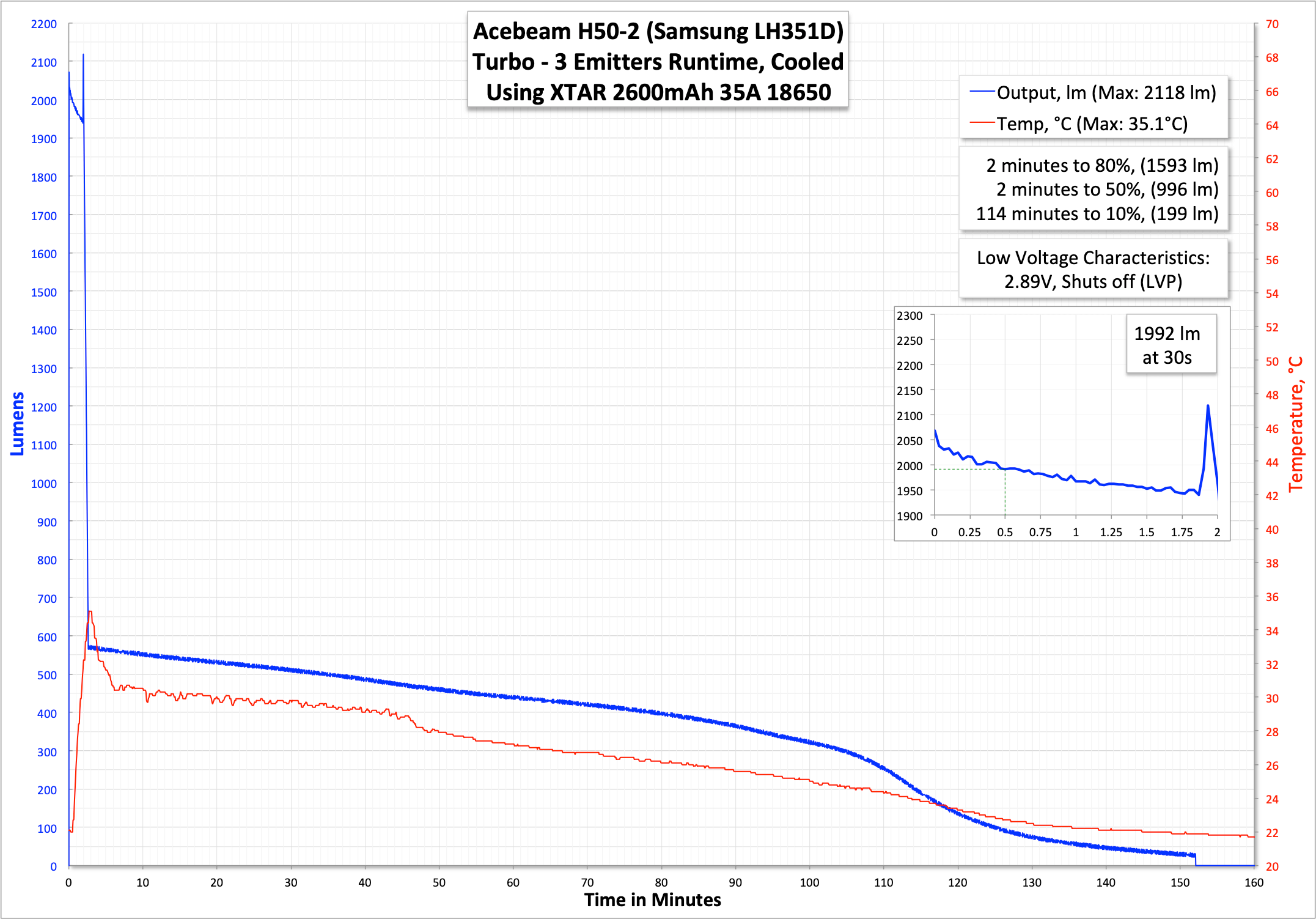 Output is respectably steady at ~2000 lumens for around 2 minutes, then drops dramatically. The light does have LVP, too.
