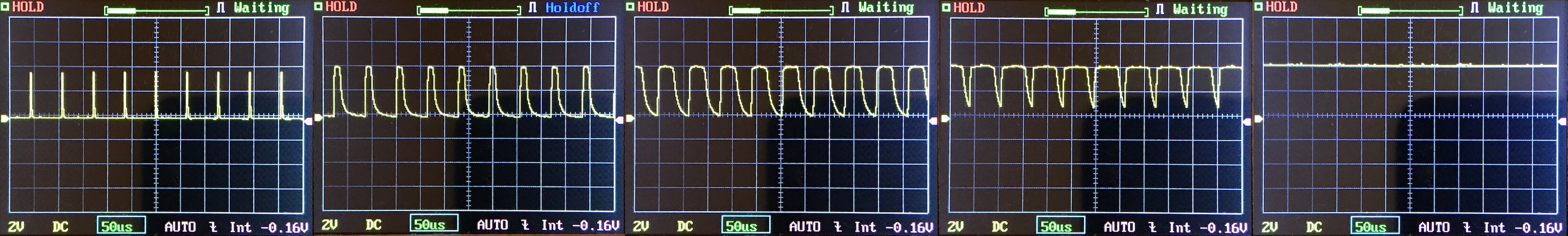 Then there’s the Ultrafire WF-602C flashlight, which has some of the worst PWM I’ve seen. It’s so bad that I used a post about it to explain PWM! Here are multiple timescales (10ms, 5ms, 2ms, 1ms, 0.5ms, 0.2ms) to make comparing this “worst” PWM light to the test light easier. That post also explains why I didn’t test the WF-602C at the usual 50us scale.