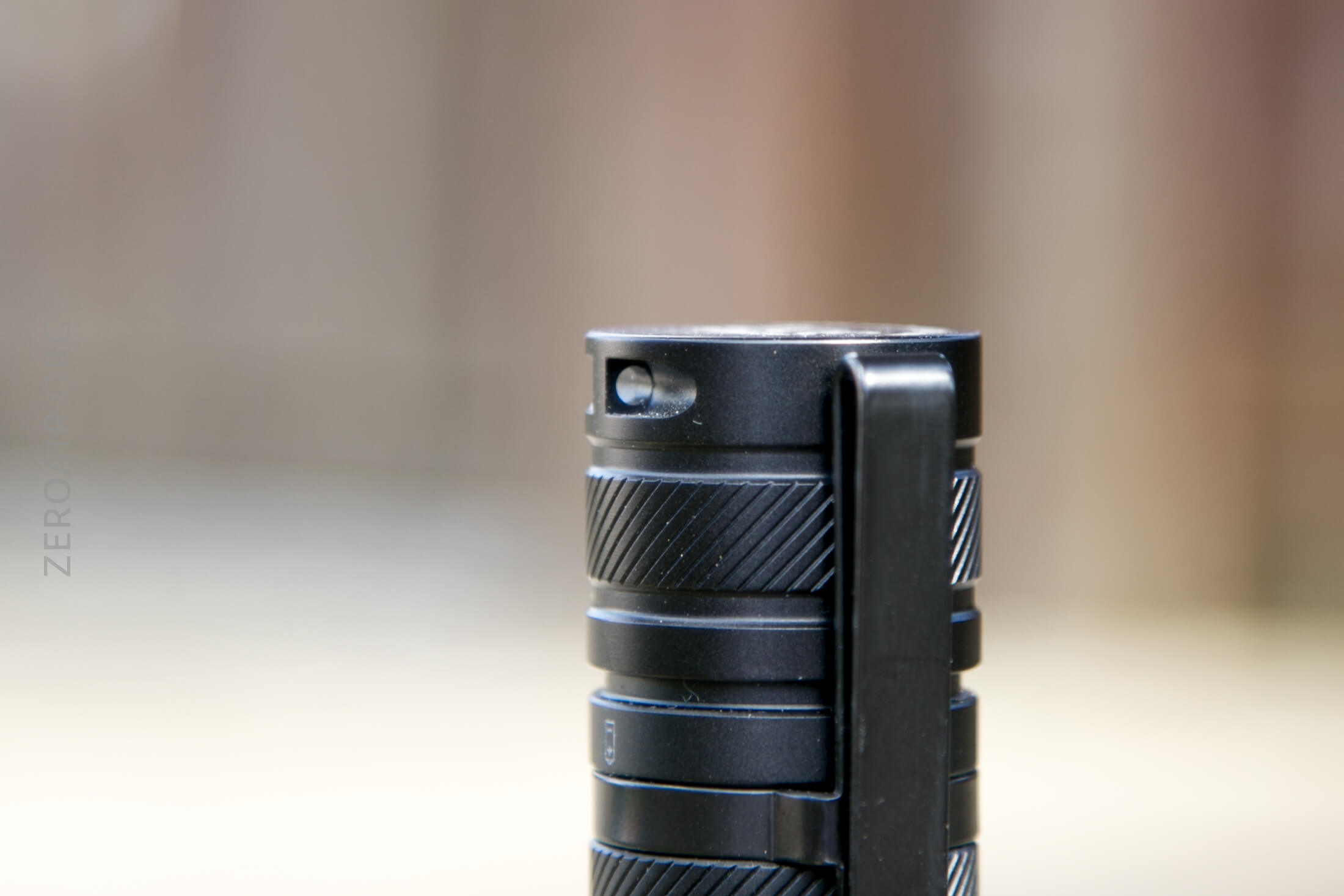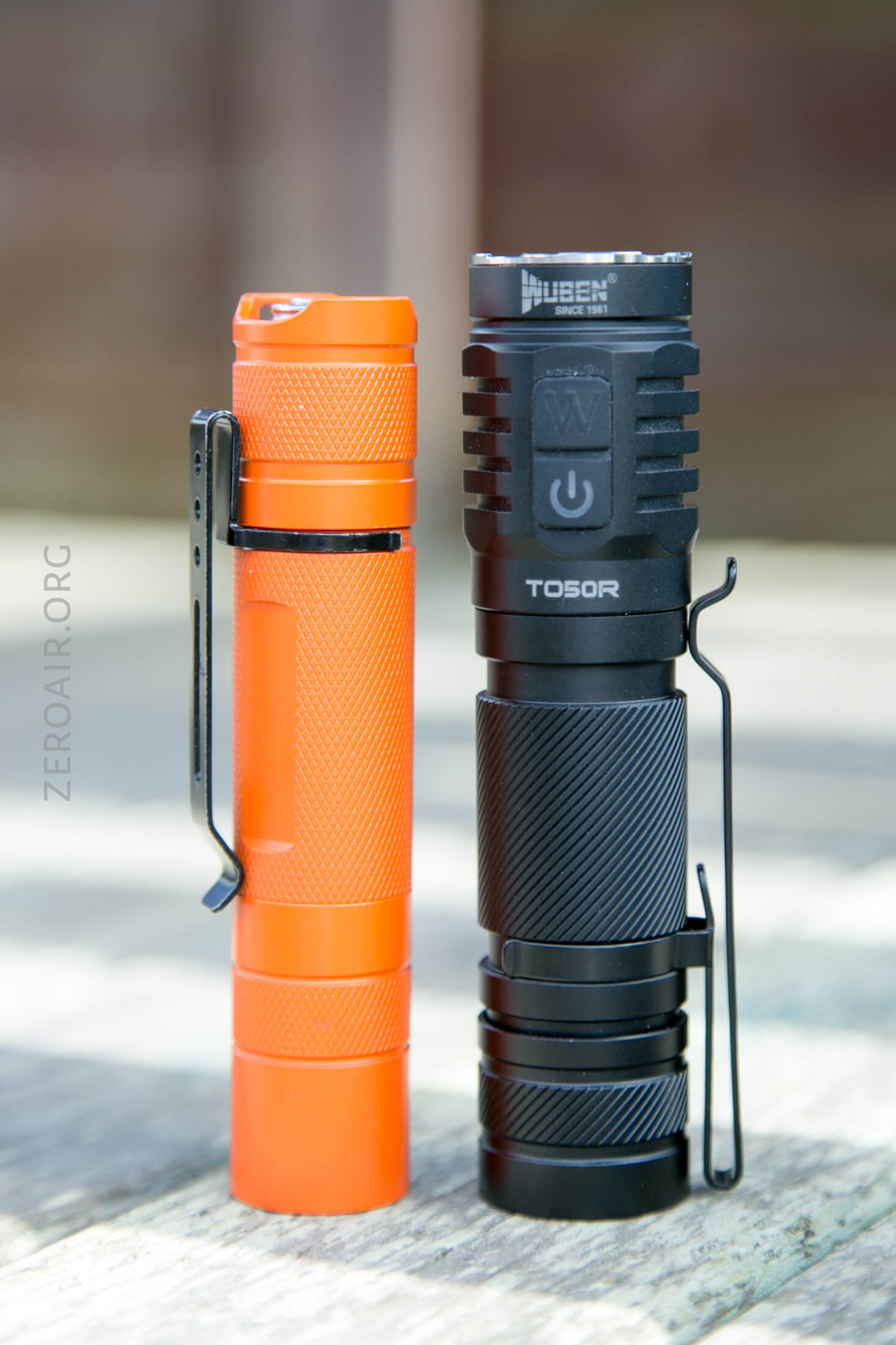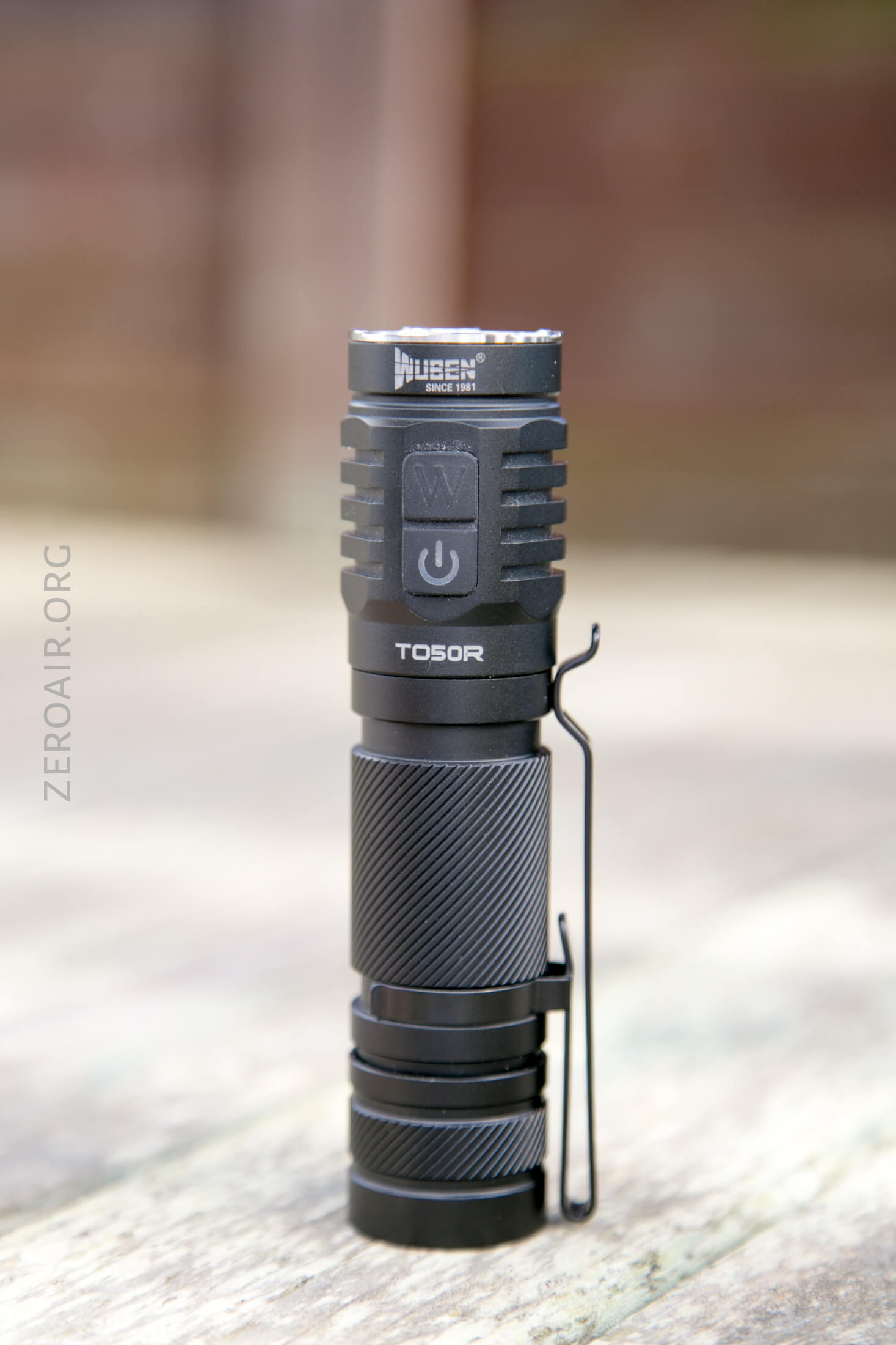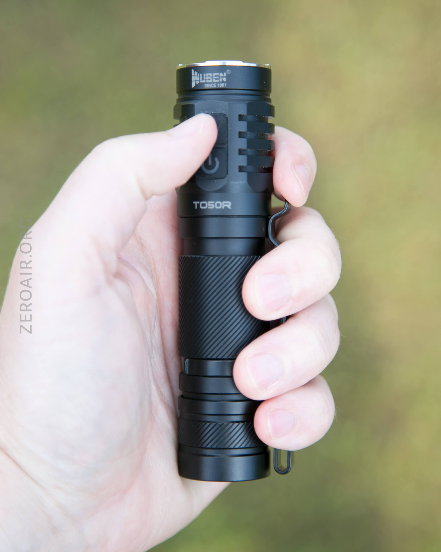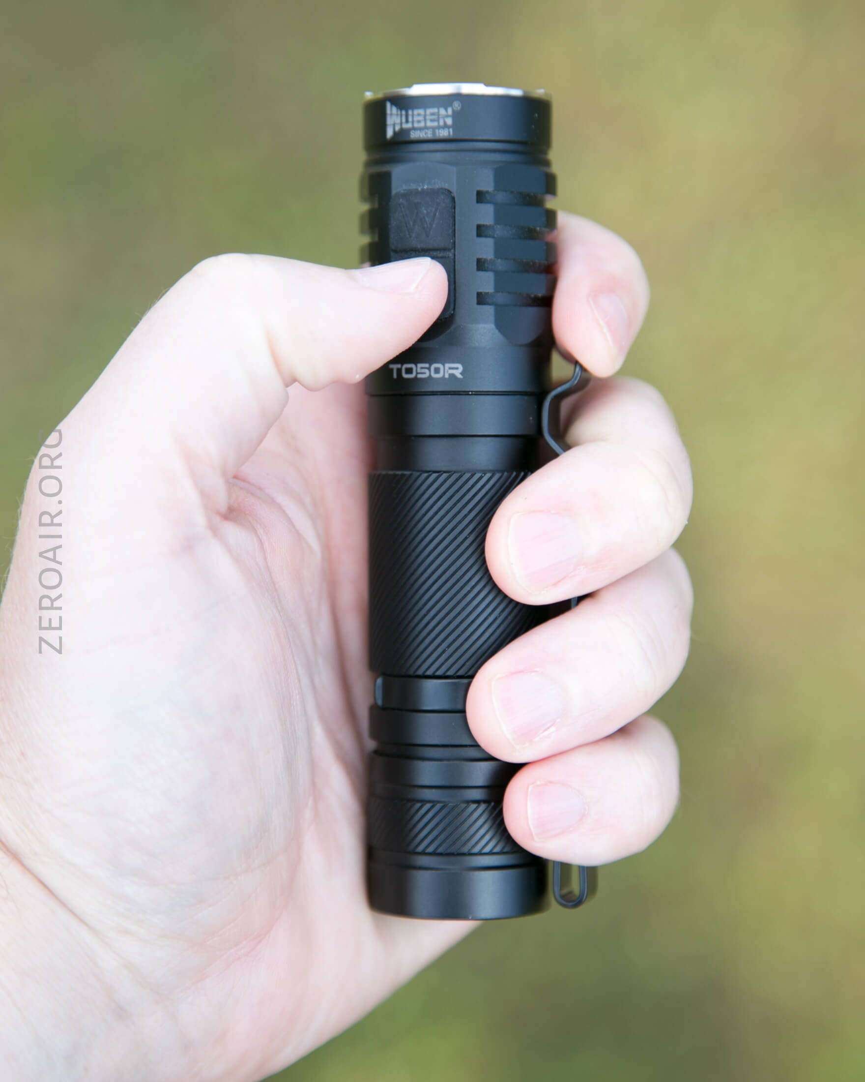 There are two switches on the TO50R. Both e-switches and both on the head. They’re together, basically one button cover but two e-switches. The power switch has an indicating function and a translucent power icon. These switches are quite clicky, with low action. The other “top” switch has a “W,” presumably for “Wuben” (but not in their logo font).