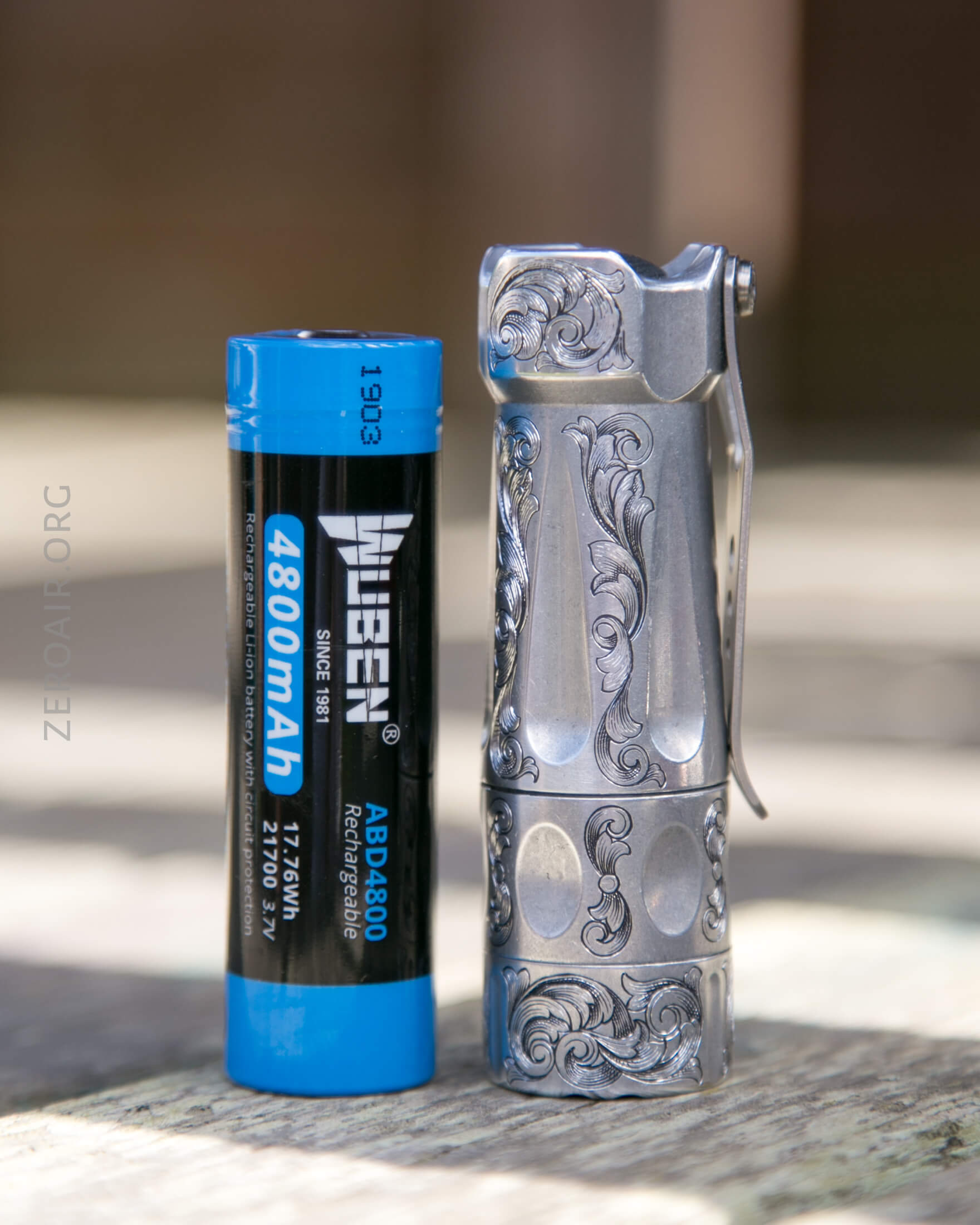 And here’s the light beside my custom-engraved TorchLAB BOSS 35, an 18350 light. I reviewed the aluminum version of that light in both 35 and 70 formats.