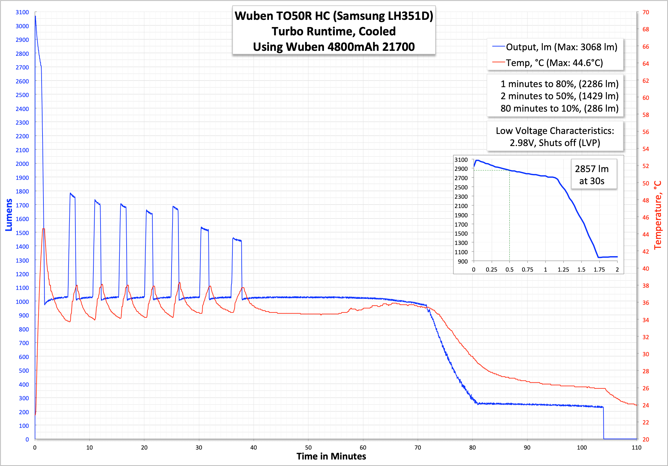Here’s a runtime on High, which is very stable at around 1300 lumens (!!!) for impressively over an hour!! LVP was exhibited here, too.