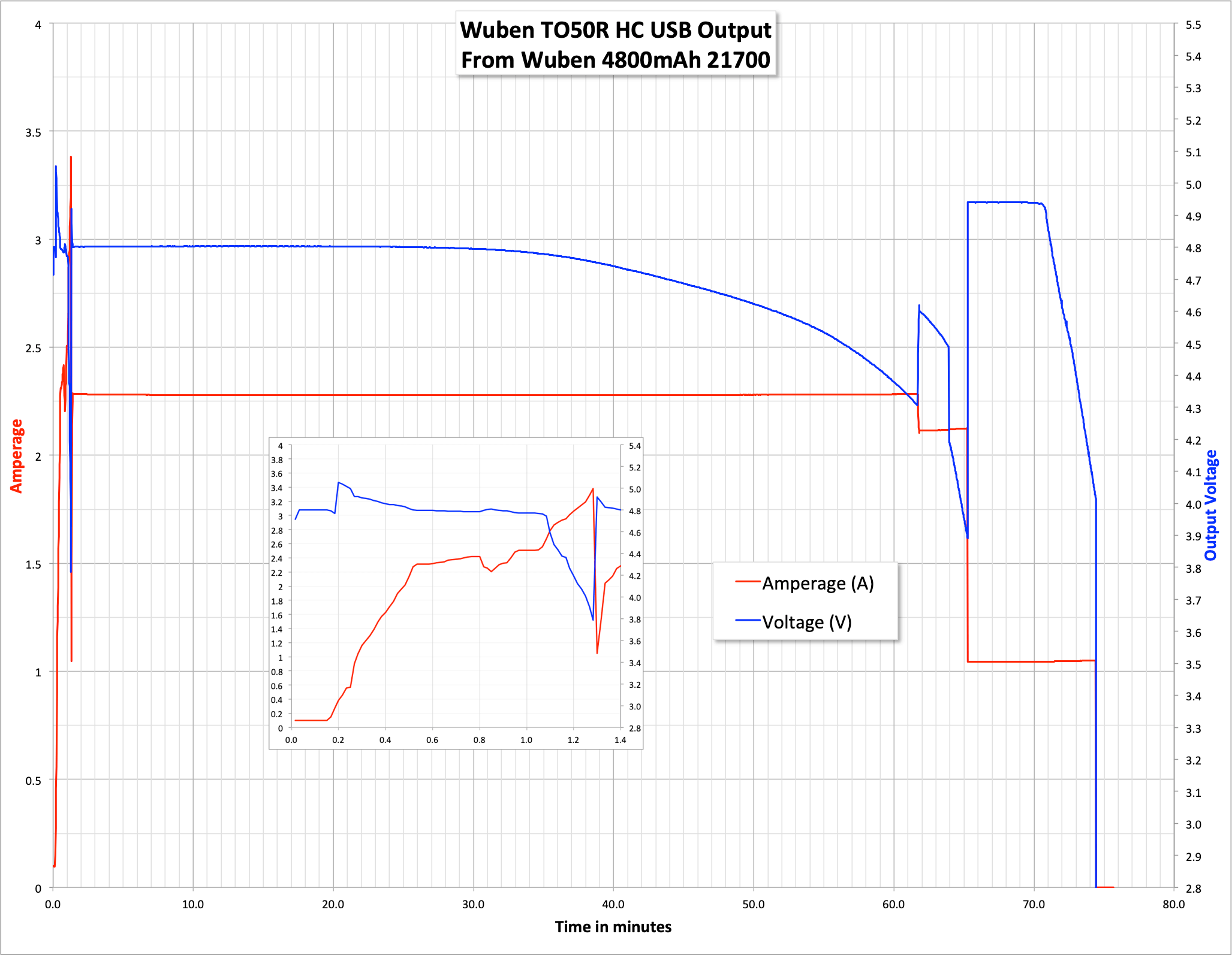 Here’s the USB output from the provided cell and the provided cable. I was able to pull around 3.4A at a maximum, but that was with significant voltage sag. But the claim of 2A output is very accurate, with a voltage of around 4.8V. Once the output shut off at 2A, I lowered my drain to 1A and pulled more energy from the cell. The light does get warm when 2A is being drawn out of this port.