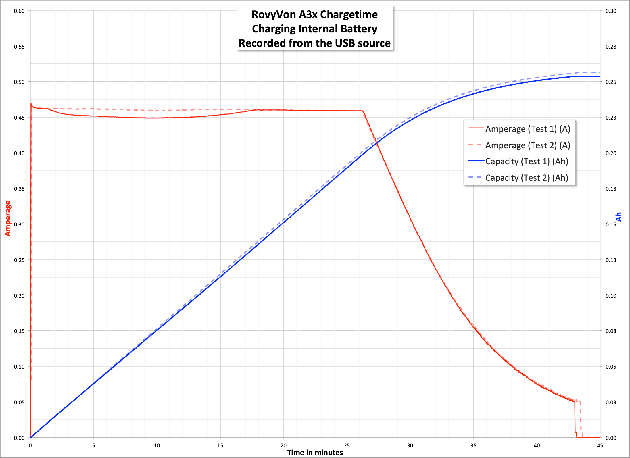 Charging proceeds about as fast as you’d want it to – around 0.5A. And the claim of 260mAh looks to be easily met since from the USB source I’m seeing around 260mAh put into the battery (after conversions, it’s likely the battery holds well over the rated 260mAh).
