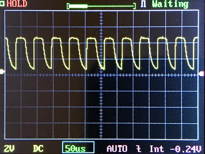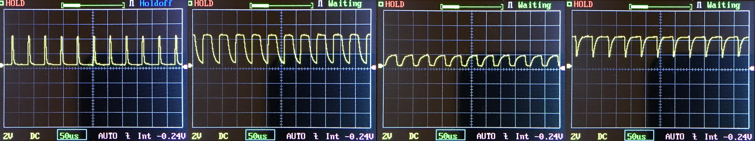 Then there’s the Ultrafire WF-602C flashlight, which has some of the worst PWM I’ve seen. It’s so bad that I used a post about it to explain PWM! Here are multiple timescales (10ms, 5ms, 2ms, 1ms, 0.5ms, 0.2ms) to make comparing this “worst” PWM light to the test light easier. That post also explains why I didn’t test the WF-602C at the usual 50us scale.