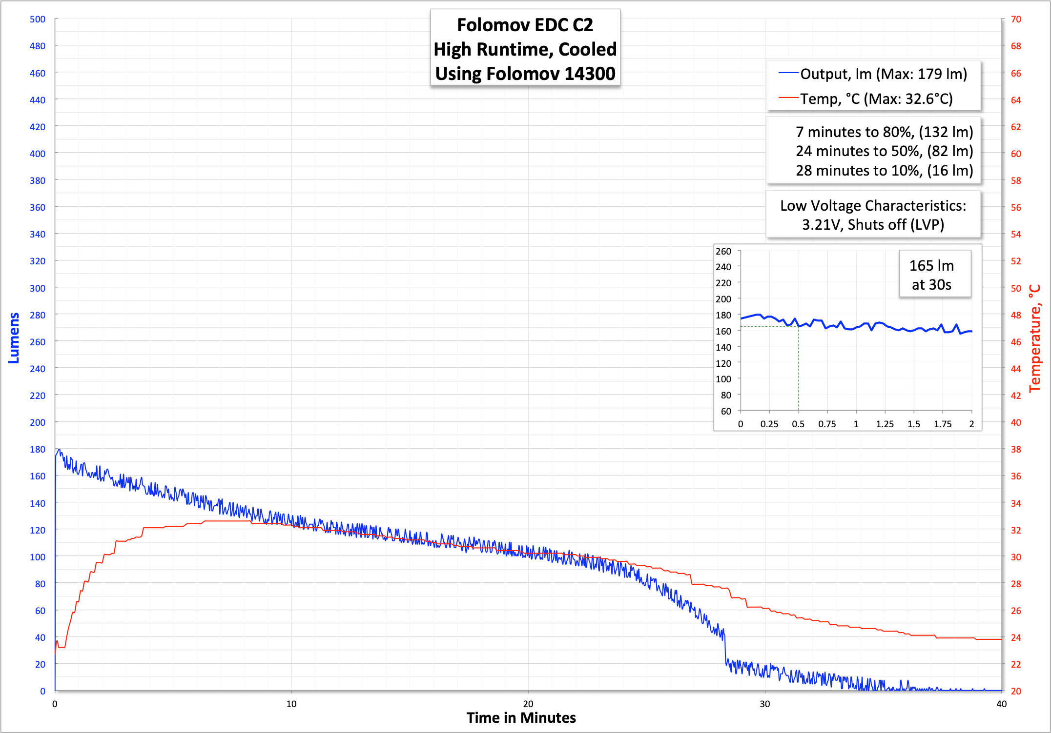 The EDC C2 is rated at 400 lumens, and it does hit that at startup, but for FL1 measurements, I’m seeing only around 189 lumens. The light does have LVP.