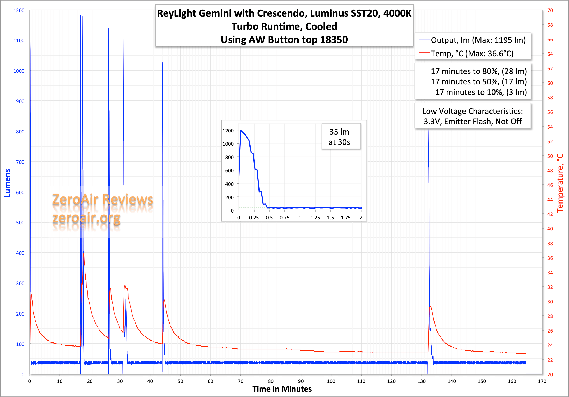 I did perform a couple of runtimes, but again, this light has been flashed with Crescendo. So I’m not sure how the stock firmware pushes this light, but as far as I can tell, this branch of Crescendo does not run the light very hard. The stepdowns are quick and very dramatic, and the light doesn’t wander back up once the temperature has been handled. So here are two mostly meaningless runtimes.