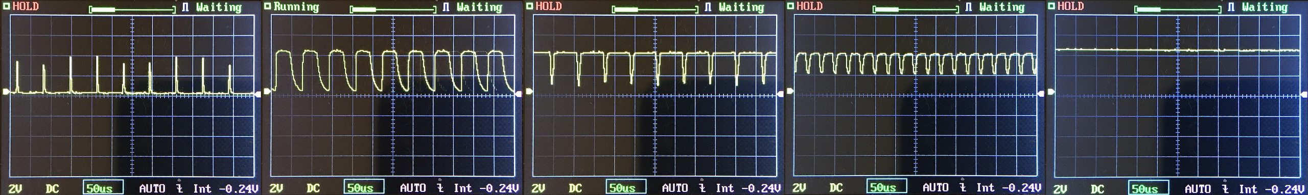 Then there’s the Ultrafire WF-602C flashlight, which has some of the worst PWM I’ve seen. It’s so bad that I used a post about it to explain PWM! Here are multiple timescales (10ms, 5ms, 2ms, 1ms, 0.5ms, 0.2ms) to make comparing this “worst” PWM light to the test light easier. That post also explains why I didn’t test the WF-602C at the usual 50us scale.