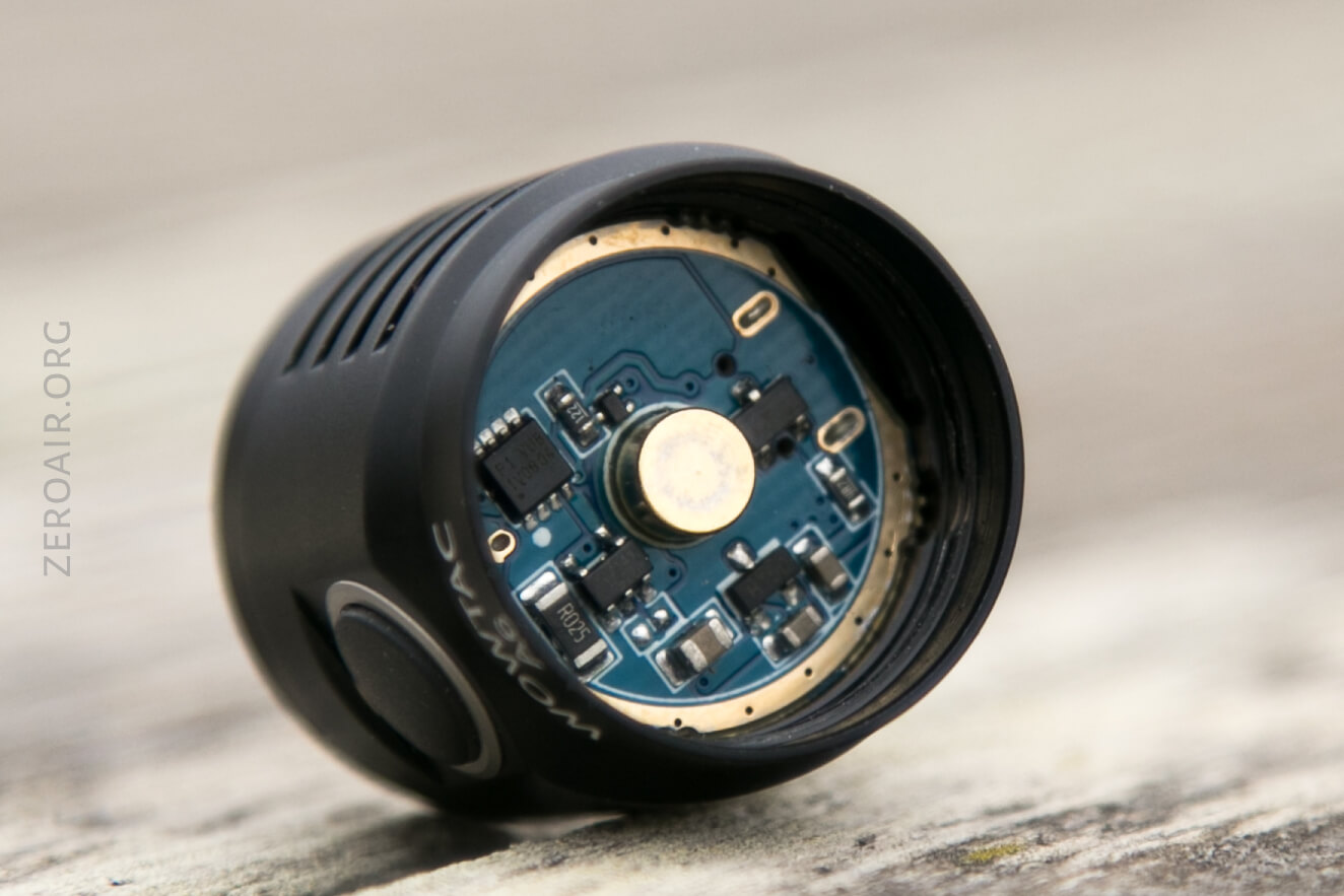 This Wowtac has a single side switch, which is an indicating e-switch. There are two emitters, displaying red and blue. The cover is clear silicone, and a little low and hard to find for my tastes – I prefer these side switches to be a bit proud like on the A4.
