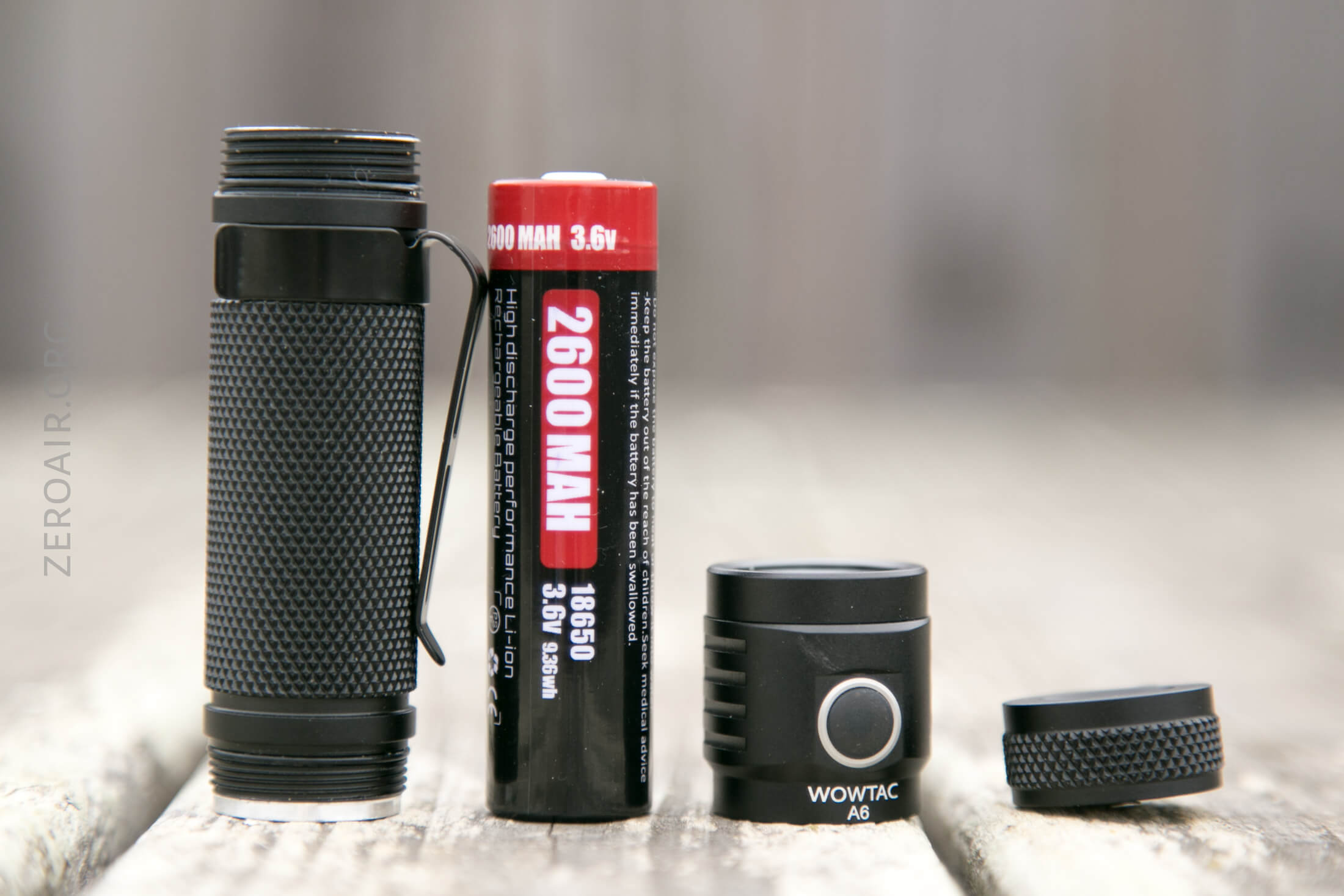 The A6 is powered by a single 18650 cell. A proper cell for this application is included. It’s a 2600mAh cell.
