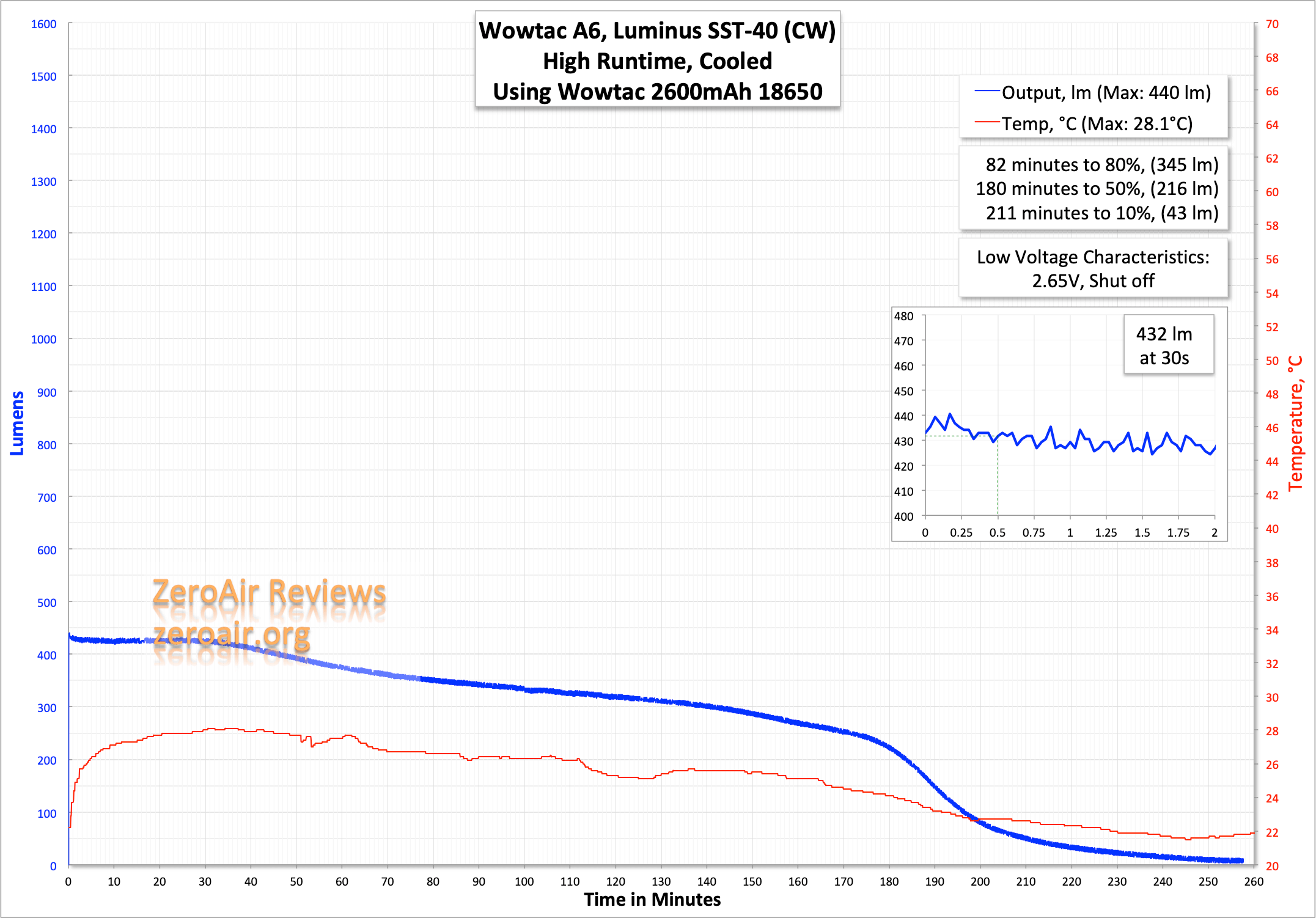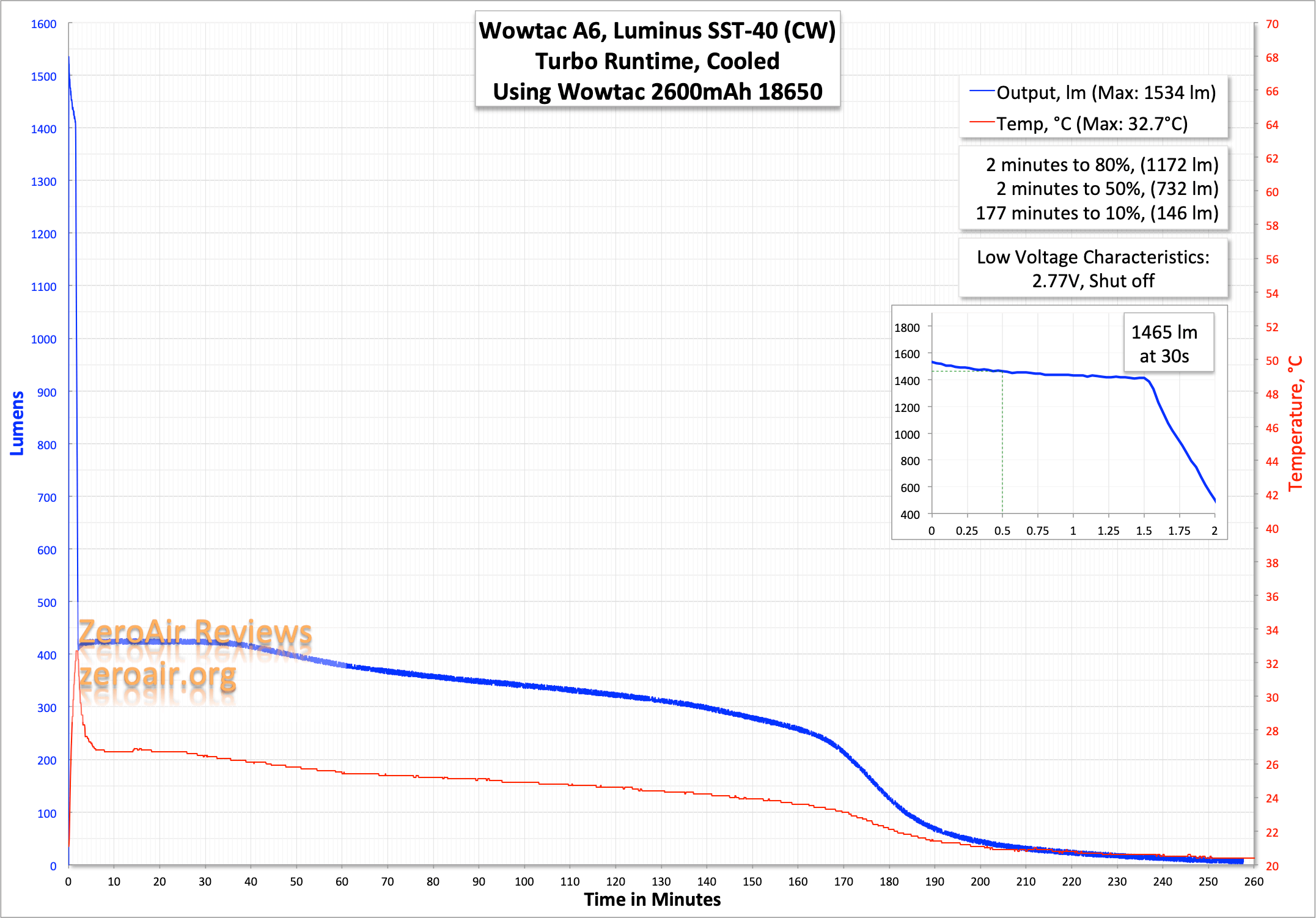High output is exactly the same as turbo after turbo steps down. The output looks to track cell voltage on the way down. The A6 does shut off, but the shut-off voltage is low (in the 2.6V range).