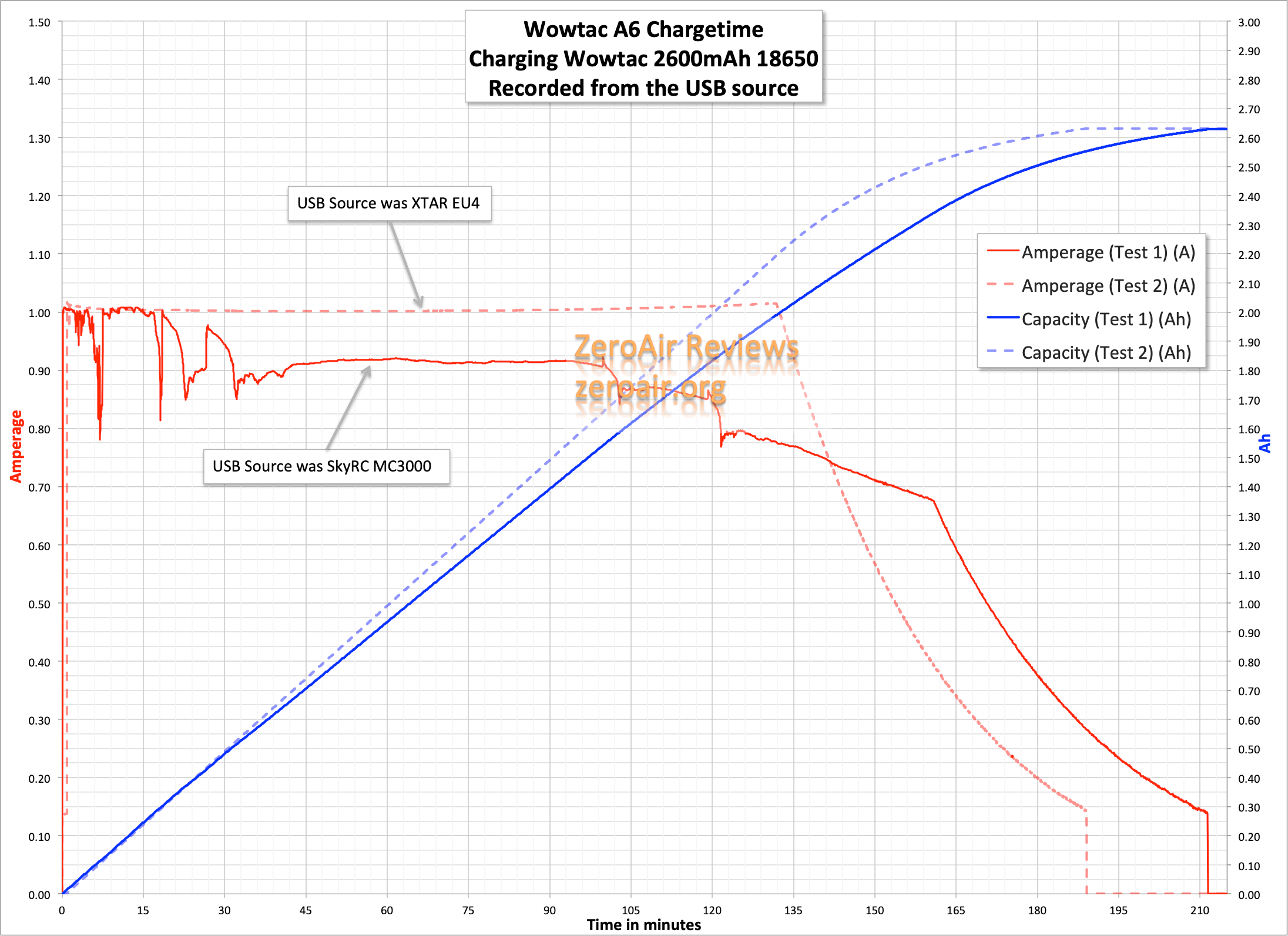 Here are a couple of charge tests. Looks like the light charges at around 1A. I used two different USB sources – it looks like the MC3000 USB out isn’t providing clean current. When the A6 has a good supply, the CC phase is 1A steady.