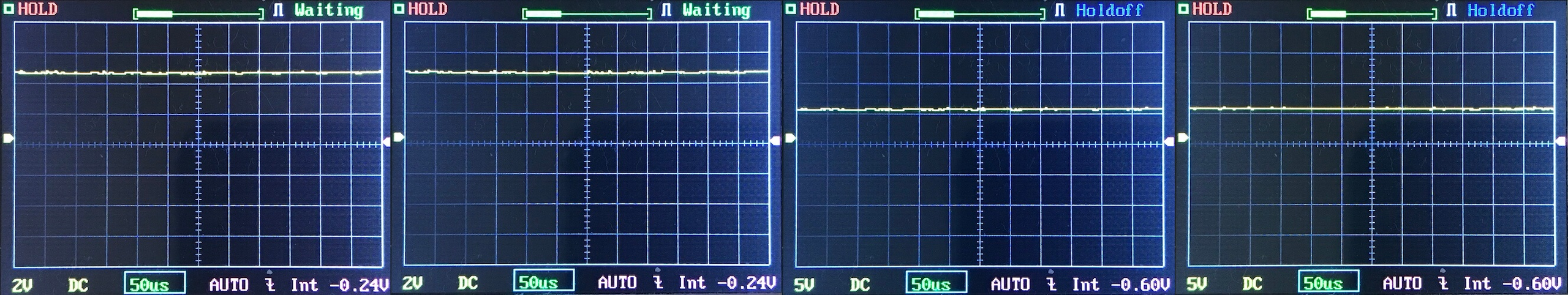 Then there’s the Ultrafire WF-602C flashlight, which has some of the worst PWM I’ve seen. It’s so bad that I used a post about it to explain PWM! Here are multiple timescales (10ms, 5ms, 2ms, 1ms, 0.5ms, 0.2ms) to make comparing this “worst” PWM light to the test light easier. That post also explains why I didn’t test the WF-602C at the usual 50us scale.