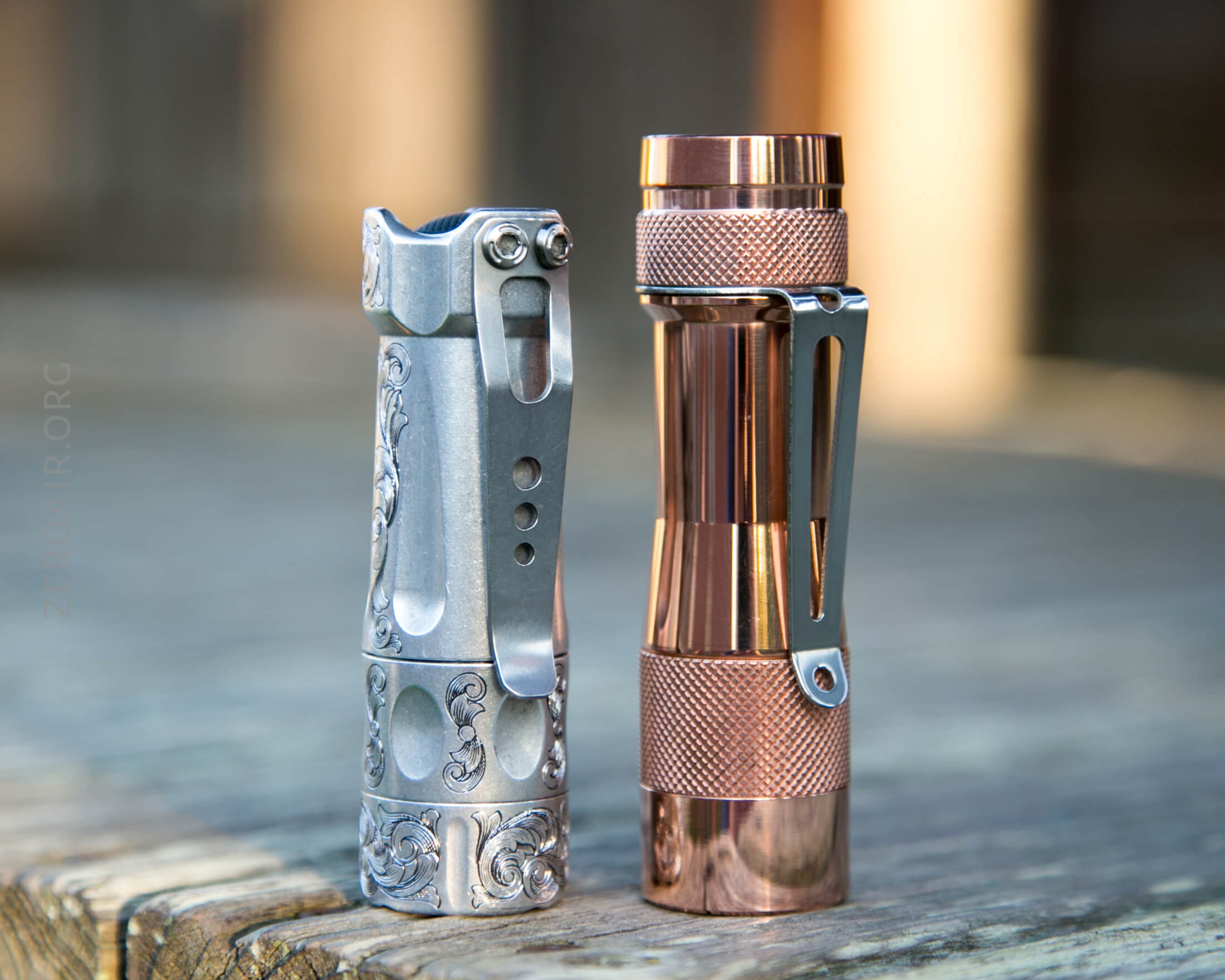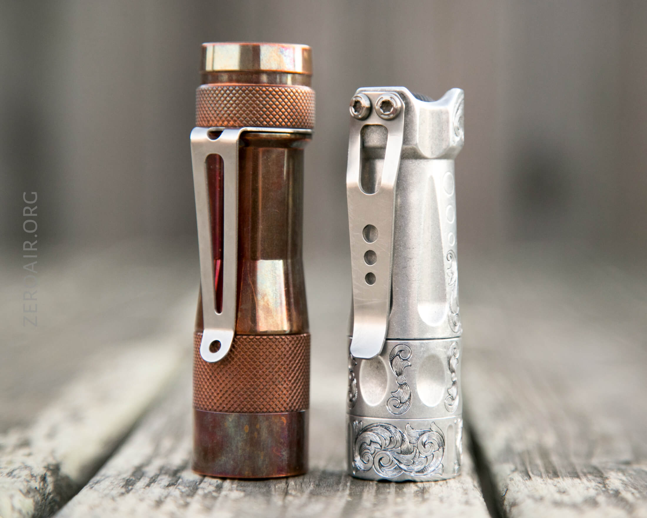 And here’s the light beside my custom-engraved TorchLAB BOSS 35, an 18350 light. I reviewed the aluminum version of that light in both 35 and 70 formats.