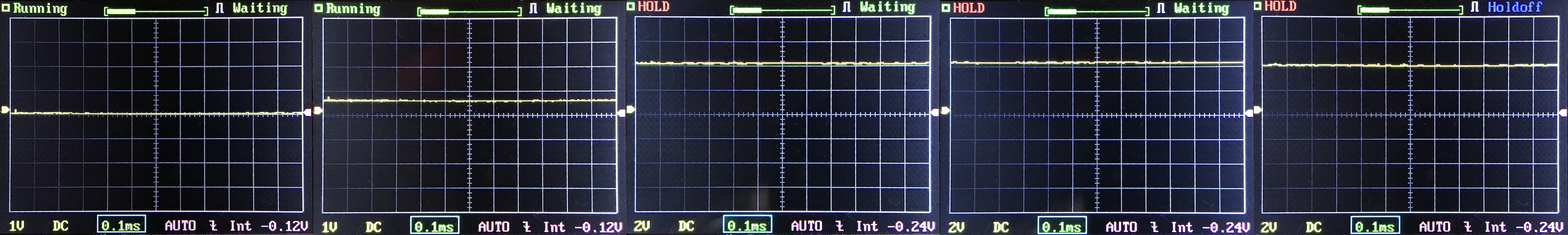 Then there’s the Ultrafire WF-602C flashlight, which has some of the worst PWM I’ve seen. It’s so bad that I used a post about it to explain PWM! Here are multiple timescales (10ms, 5ms, 2ms, 1ms, 0.5ms, 0.2ms) to make comparing this “worst” PWM light to the test light easier. That post also explains why I didn’t test the WF-602C at the usual 50us scale.