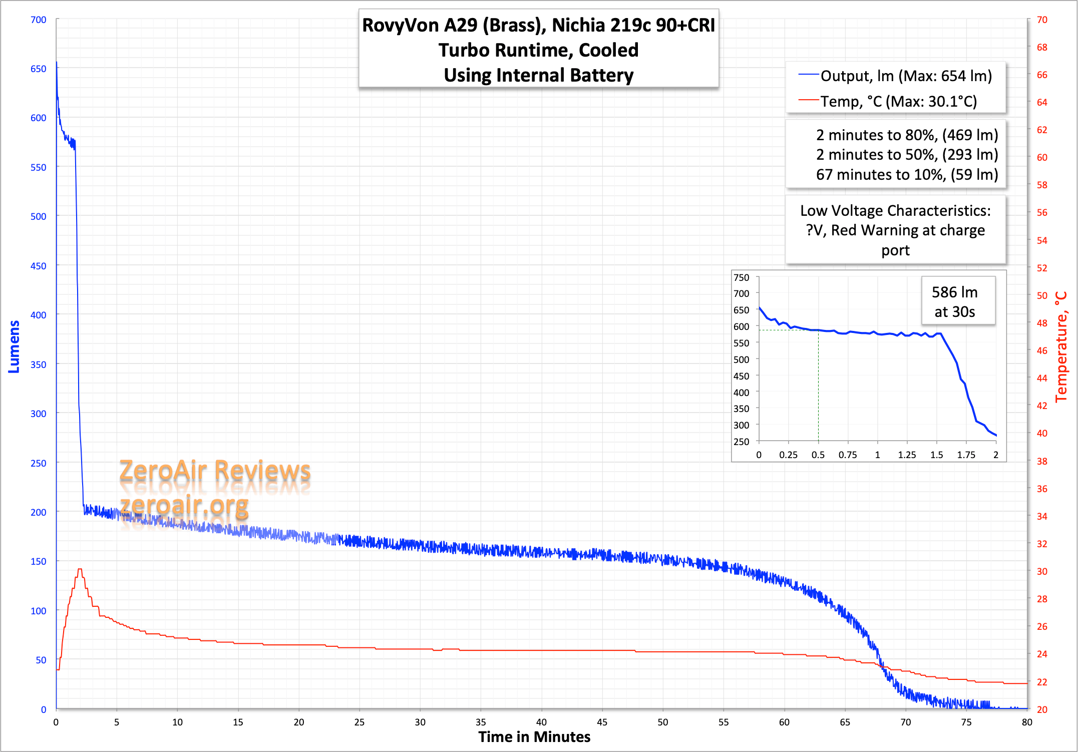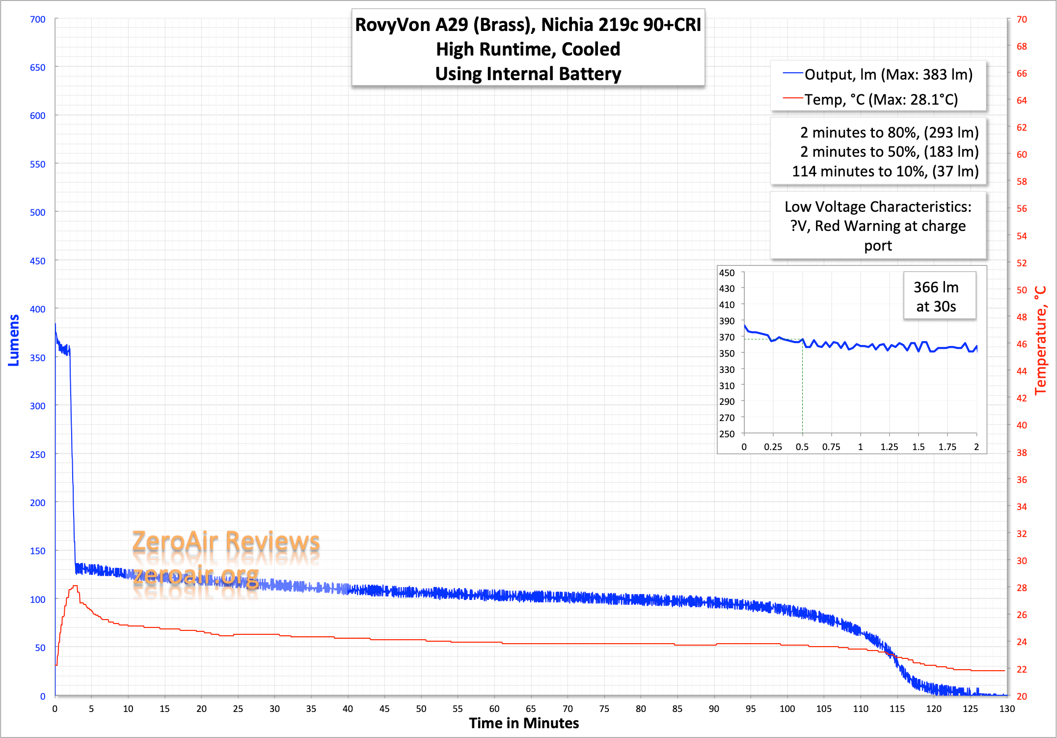 Here are a couple of runtimes on the highest main modes. As you can see, unlike the plastic A28, the output is stable for much longer (1.5 minutes at least) but is still lower than the rated 700 lumens.