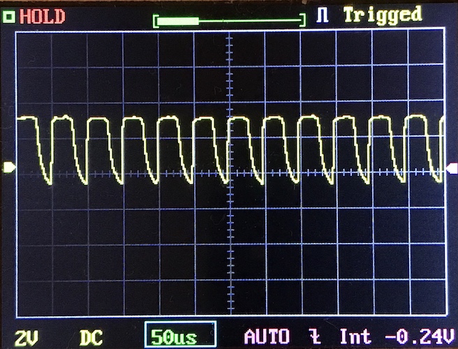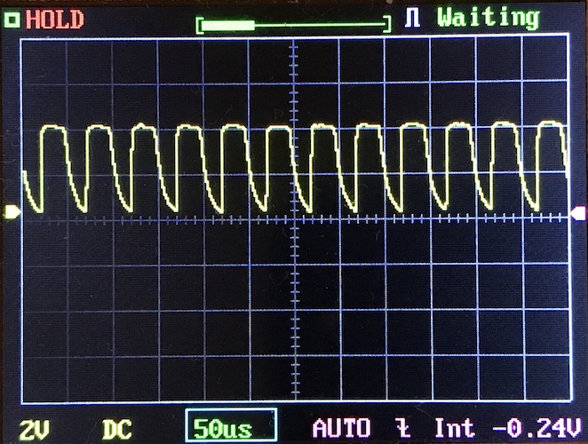 Then there’s the Ultrafire WF-602C flashlight, which has some of the worst PWM I’ve seen. It’s so bad that I used a post about it to explain PWM! Here are multiple timescales (10ms, 5ms, 2ms, 1ms, 0.5ms, 0.2ms) to make comparing this “worst” PWM light to the test light easier. That post also explains why I didn’t test the WF-602C at the usual 50us scale.