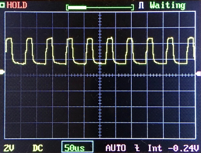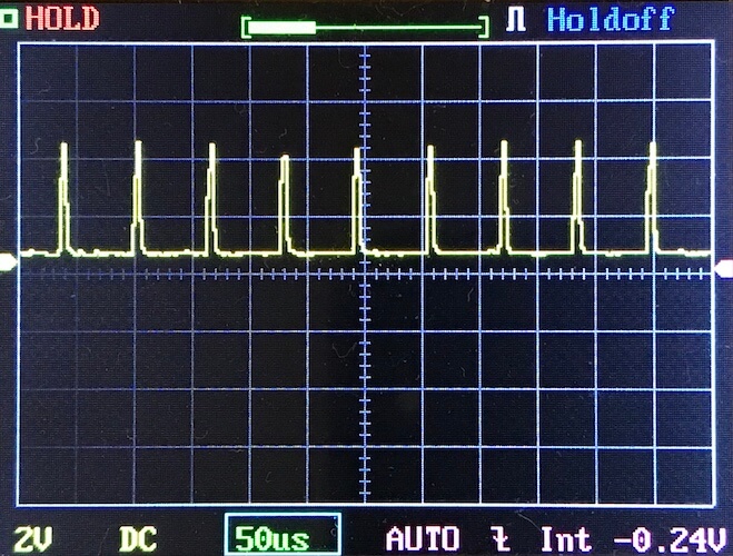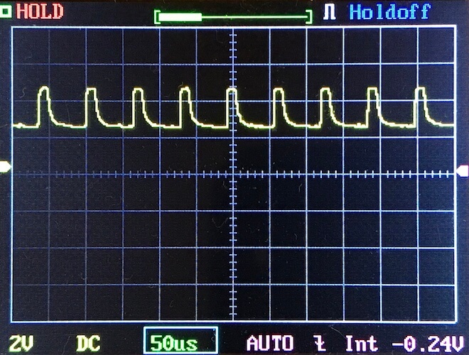 Then there’s the Ultrafire WF-602C flashlight, which has some of the worst PWM I’ve seen. It’s so bad that I used a post about it to explain PWM! Here are multiple timescales (10ms, 5ms, 2ms, 1ms, 0.5ms, 0.2ms) to make comparing this “worst” PWM light to the test light easier. That post also explains why I didn’t test the WF-602C at the usual 50us scale.