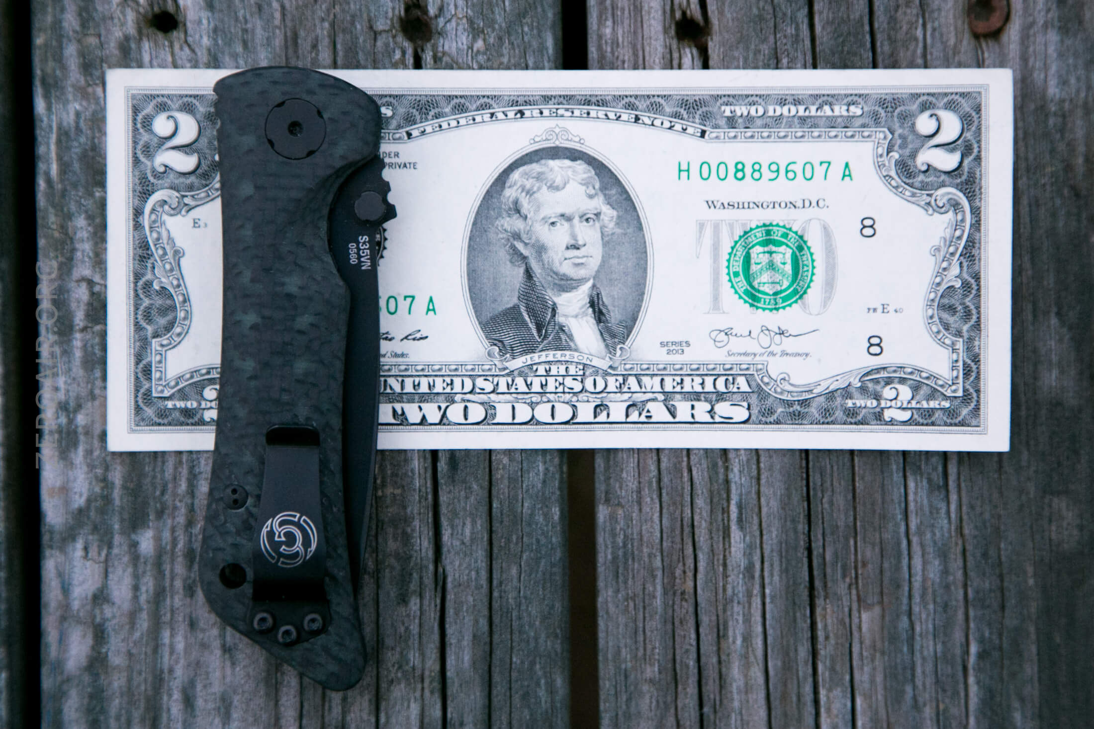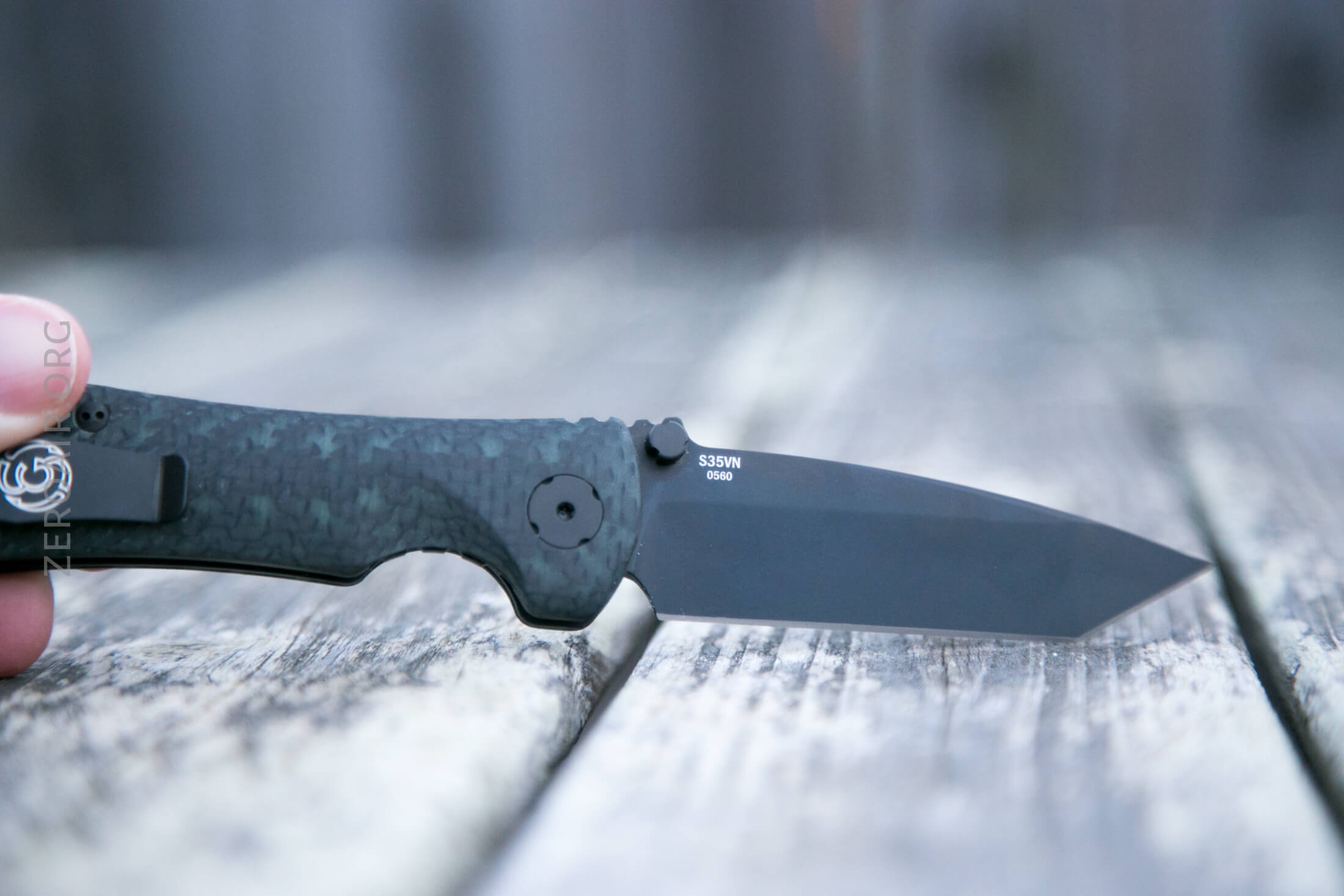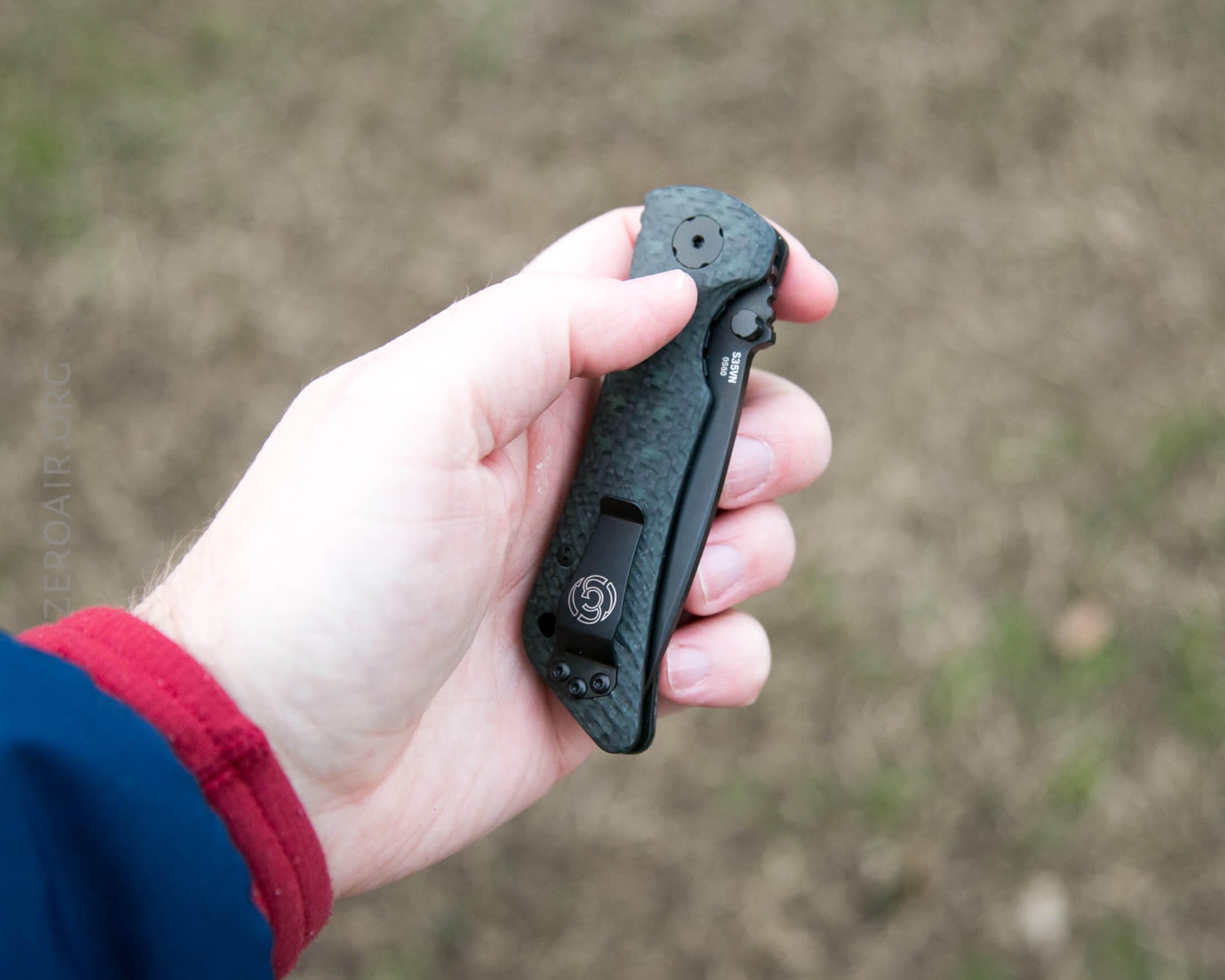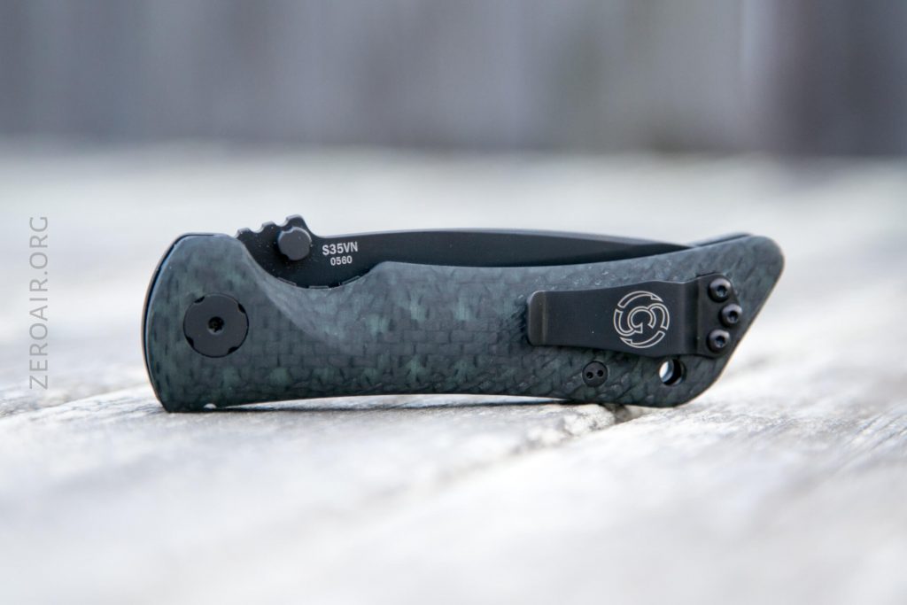 There it is. It’s a very fetching knife if you’re into carbon fiber. I happen to be very into carbon fiber, so I love the look. In most of the photos seen here, a very slight green tint can be seen in the carbon fiber… that’s the glow material. It’s not actually seen as glowing but the glow material is green.