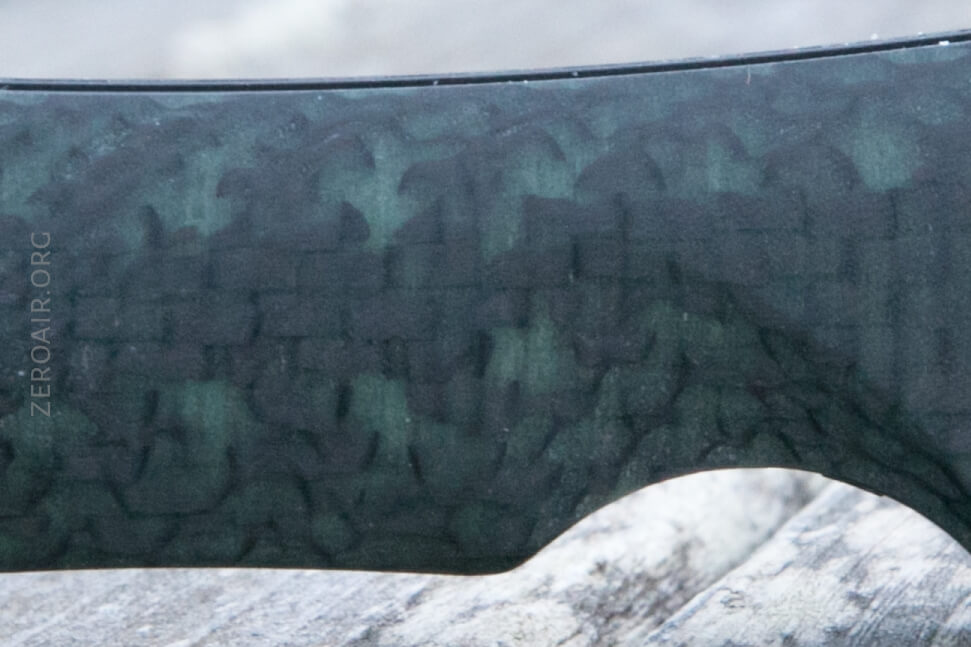 A closer shot of the green in the scales. I believe what’s glowing isn’t a laid-down layer of glow material, but a glow epoxy, which was likely used to hold the carbon fiber together (as with all carbon fiber). This is neither bad nor good, but that’s why it looks like it does.