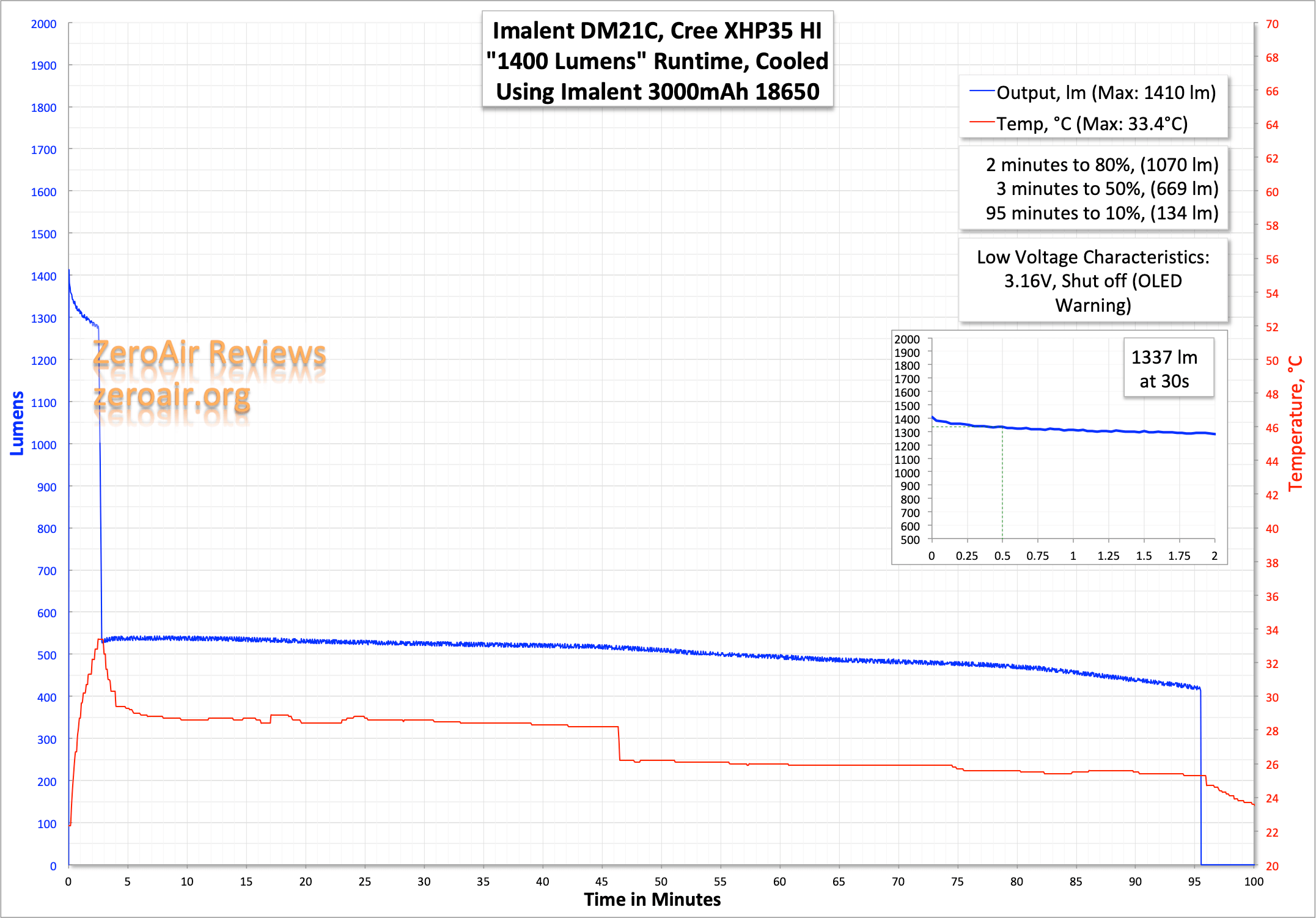 Here are a couple of runtimes. The light does step down pretty dramatically, but the manual states that it will, so kudos to Imalent’s honesty there. I measured the output being a bit lower than specification, unfortunately, but 1721 lumens is still a lot for an 18650 tube light.