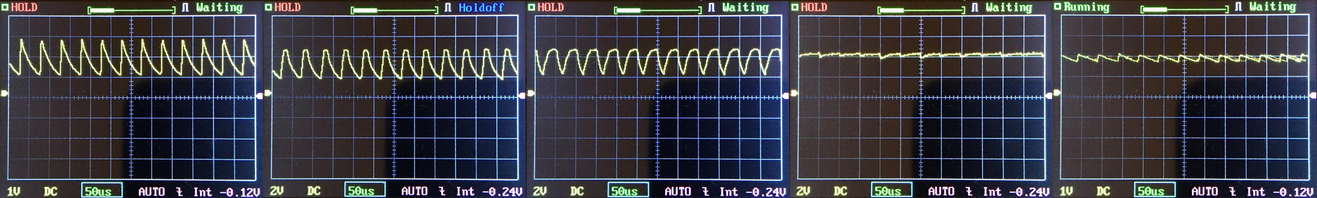 Then there’s the Ultrafire WF-602C flashlight, which has some of the worst PWM I’ve seen. It’s so bad that I used a post about it to explain PWM! Here are multiple timescales (10ms, 5ms, 2ms, 1ms, 0.5ms, 0.2ms) to make comparing this “worst” PWM light to the test light easier. That post also explains why I didn’t test the WF-602C at the usual 50us scale.