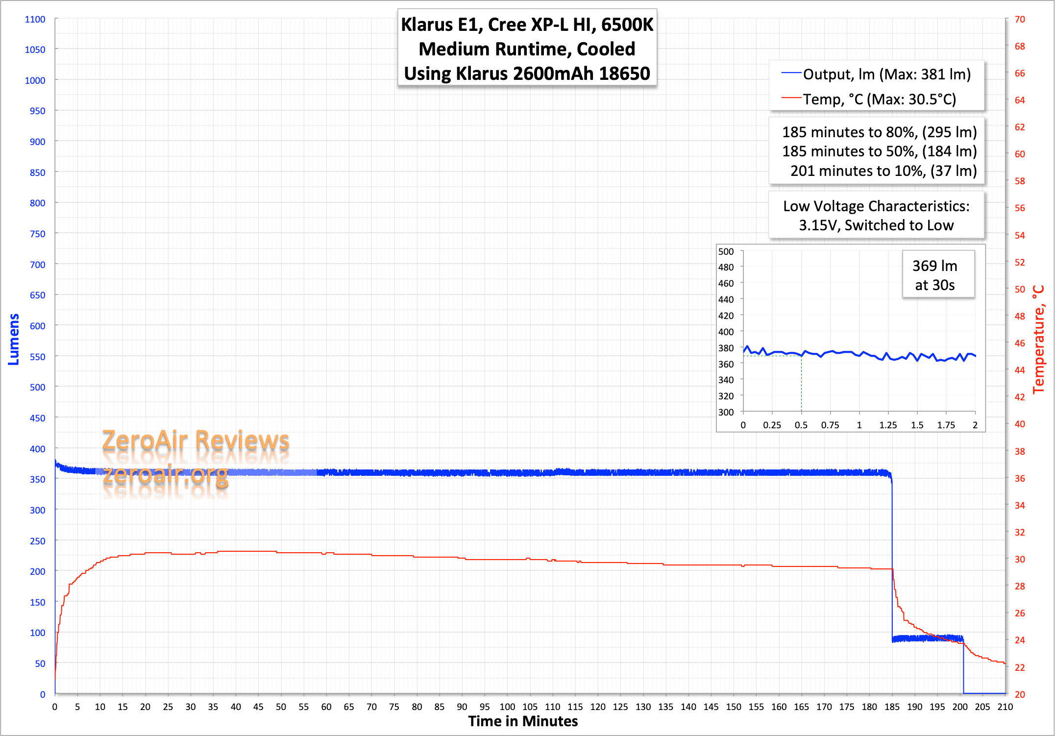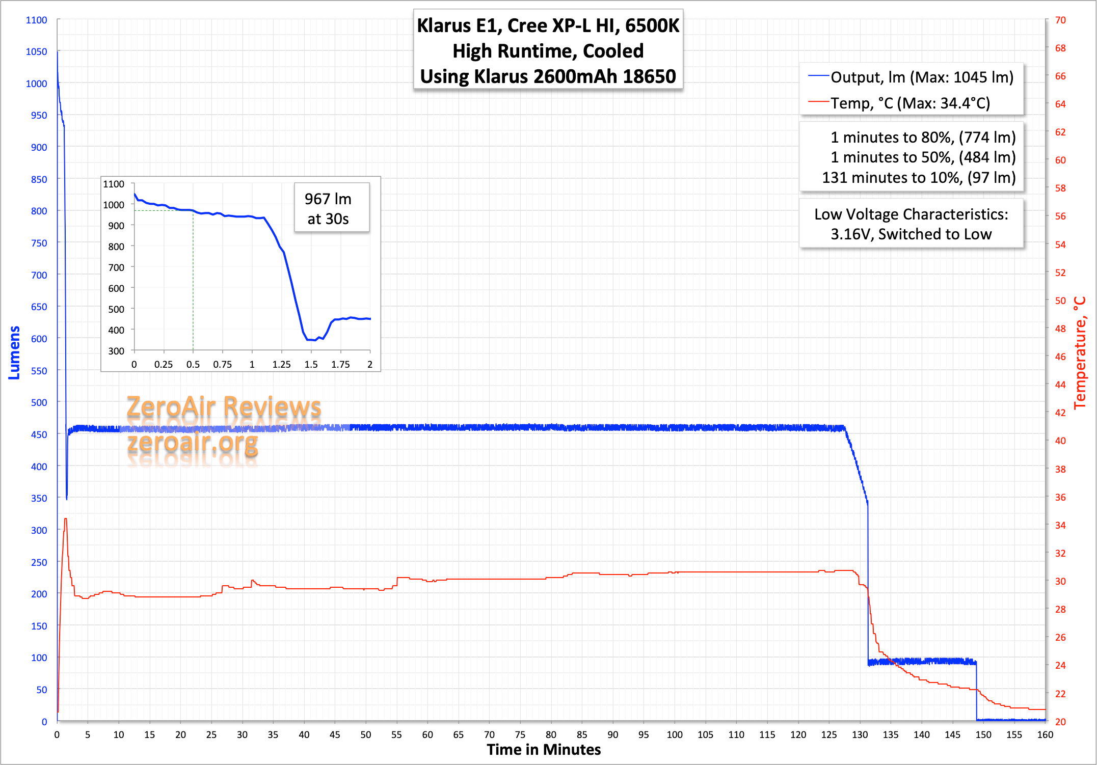 Here are a couple of runtimes. The light performs well, meeting spec. The stepdown after the initial 1000 on High really is quite dramatic, but still around 450 lumens. The light switched to very low output when the voltage was low.