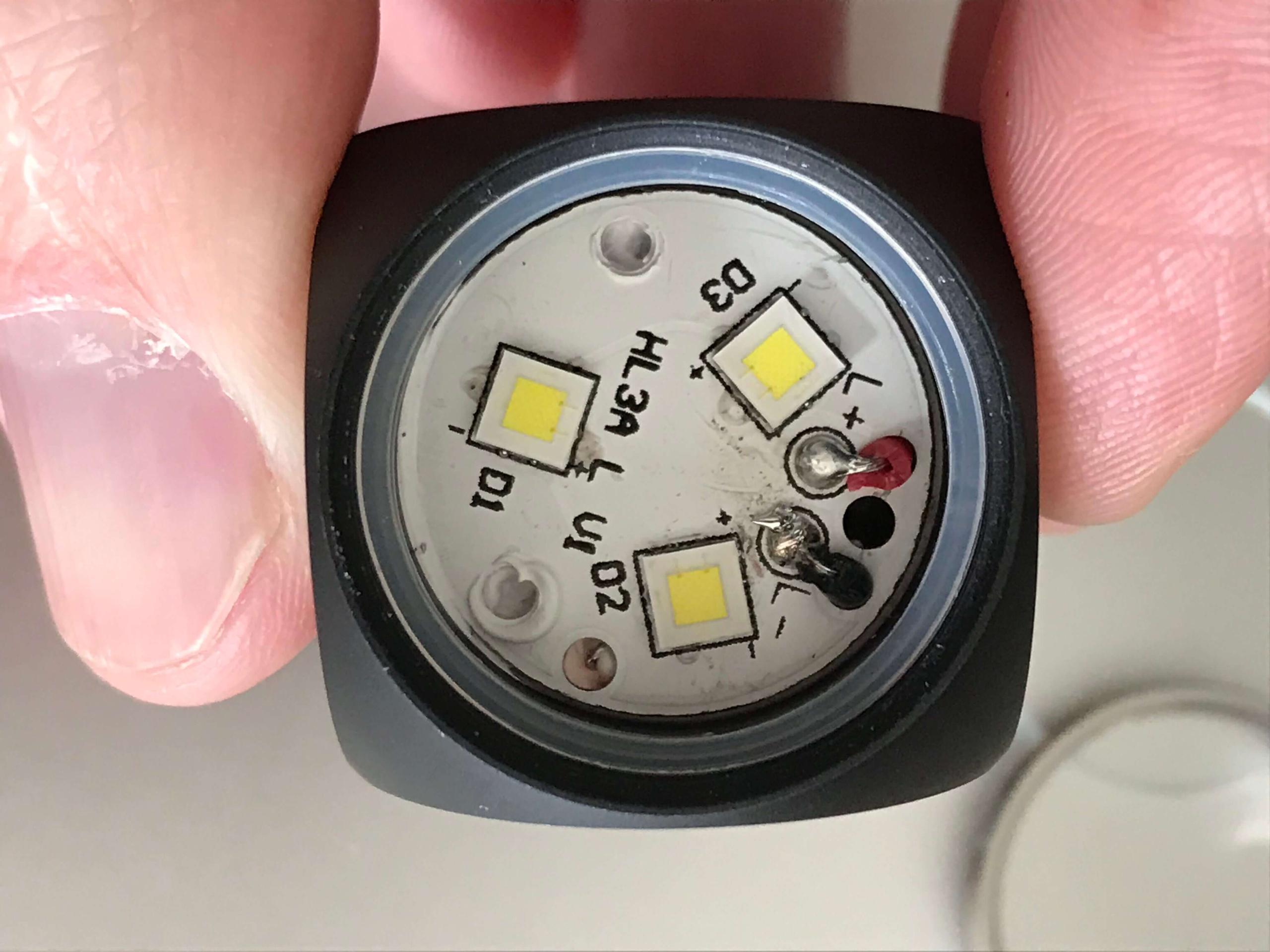 The emitters here are three Cree XP-L HI. I love this emitter in general, but the temperature here is cool white, which is not my favorite.