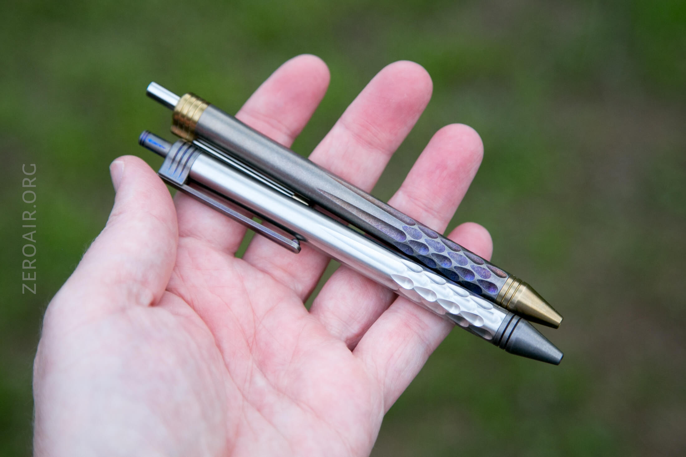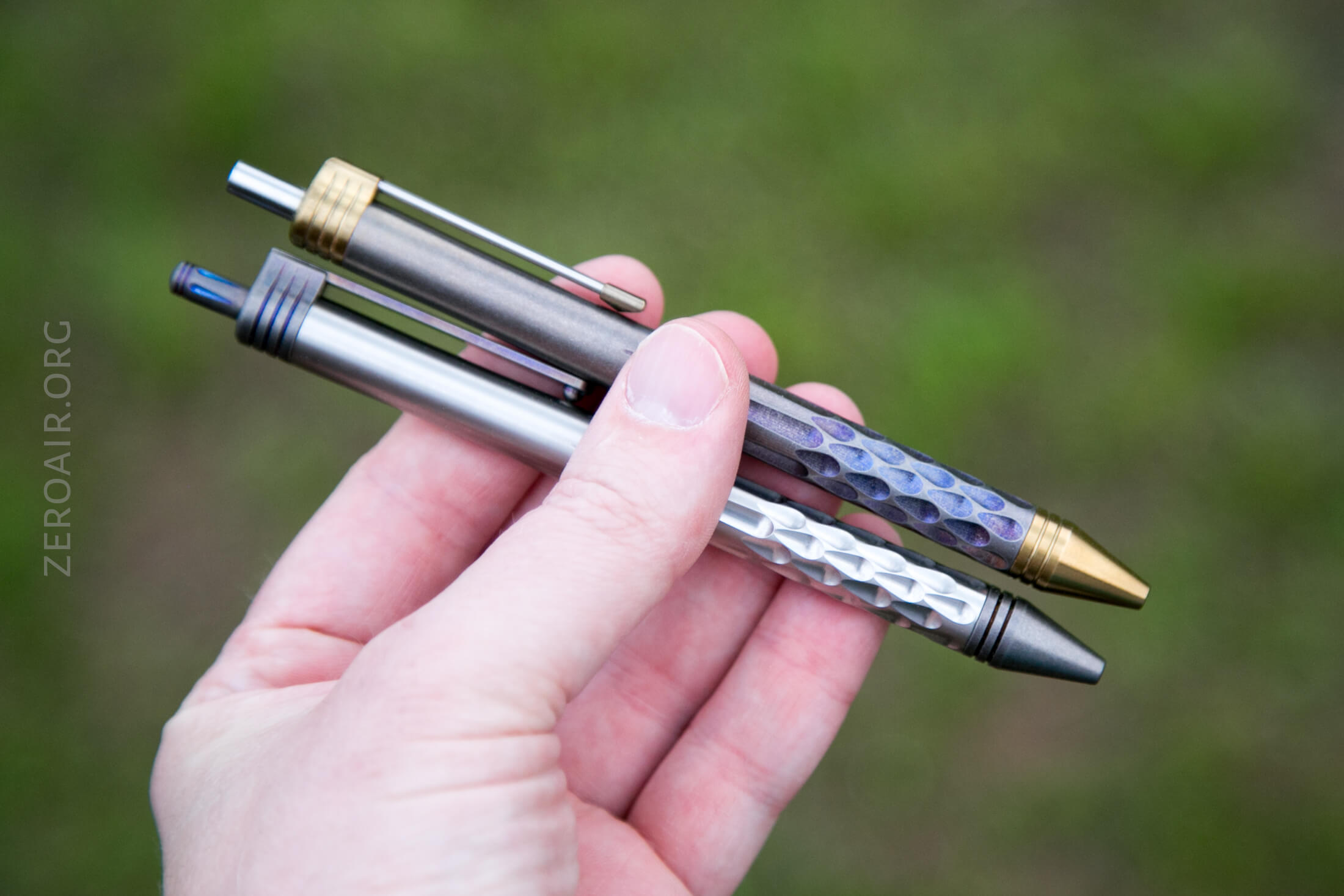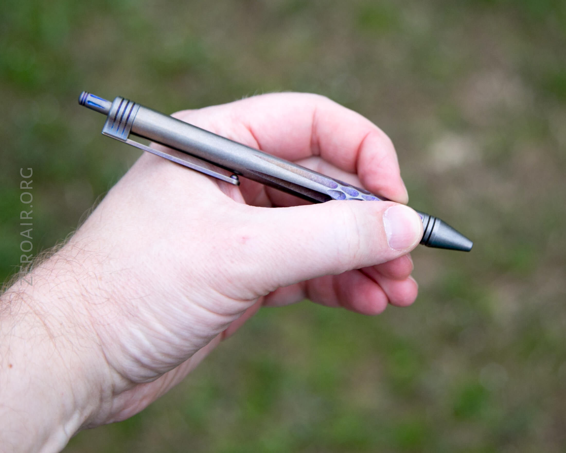 The pen itself in hand feels excellent too. The titanium tube has just a bit of [stonewash-like] texture, and the teardrops around the grip area mostly just signify where to grasp the pen; they don’t provide much extra grip. That’s not all that unusual in this type of pen. The tip has a couple of rings, but that’s well below where I hold the pen, so they’re not providing grip, either.