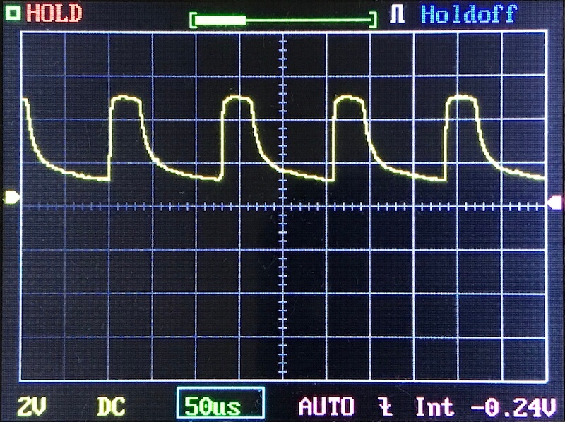 Then there’s the Ultrafire WF-602C flashlight, which has some of the worst PWM I’ve seen. It’s so bad that I used a post about it to explain PWM! Here are multiple timescales (10ms, 5ms, 2ms, 1ms, 0.5ms, 0.2ms) to make comparing this “worst” PWM light to the test light easier. That post also explains why I didn’t test the WF-602C at the usual 50us scale.