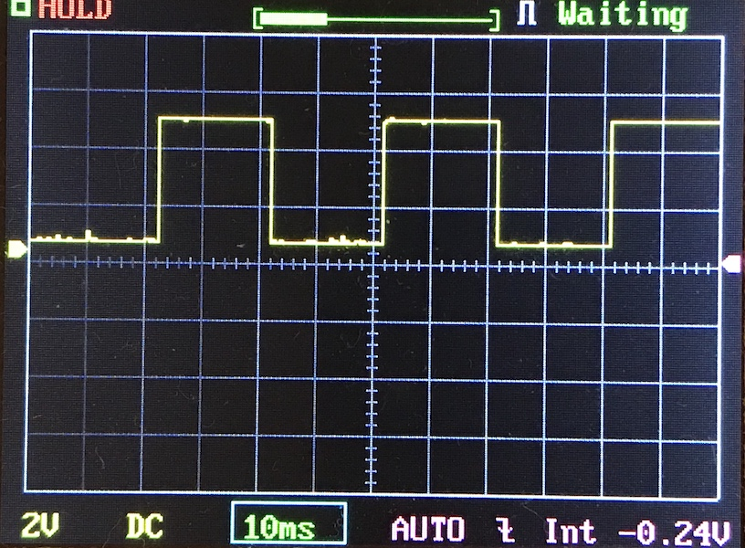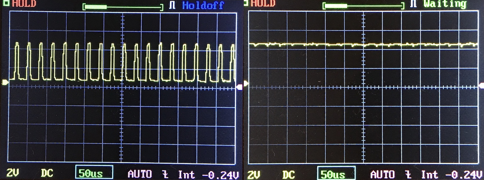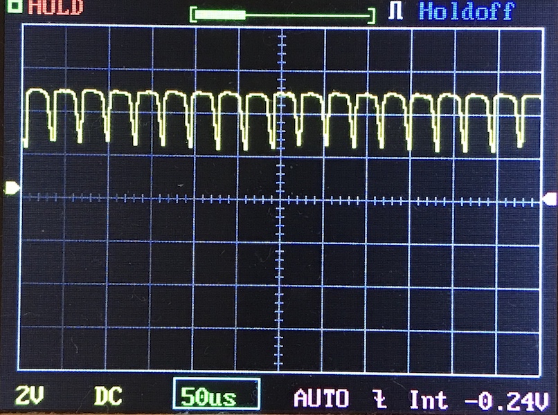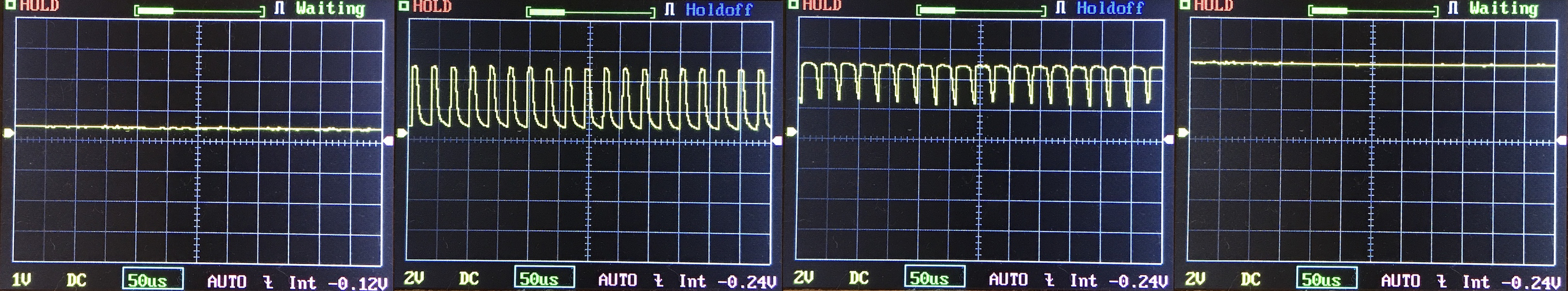 Then there’s the Ultrafire WF-602C flashlight, which has some of the worst PWM I’ve seen. It’s so bad that I used a post about it to explain PWM! Here are multiple timescales (10ms, 5ms, 2ms, 1ms, 0.5ms, 0.2ms) to make comparing this “worst” PWM light to the test light easier. That post also explains why I didn’t test the WF-602C at the usual 50us scale.
