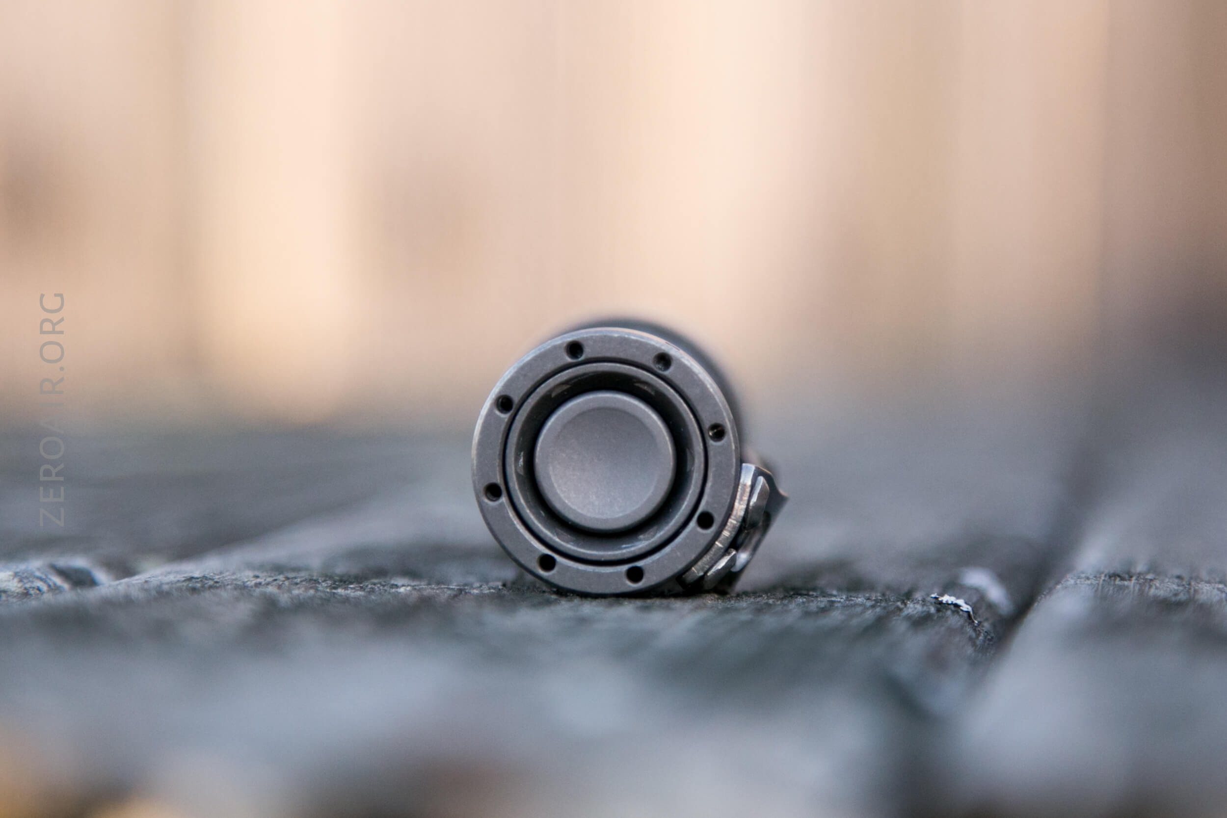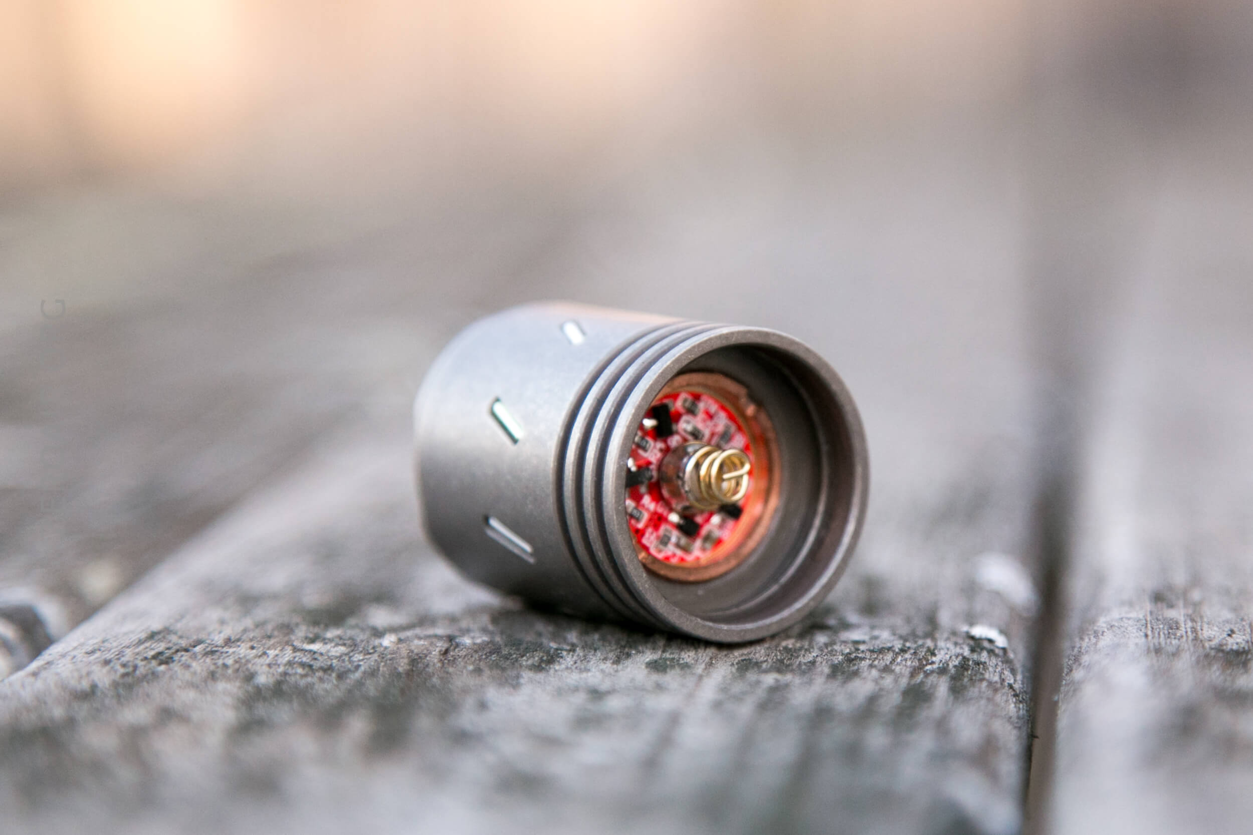 There are numerous versions of the Krystal, but they’re all essentially similar. Only one metal is available: titanium. Two finishes are possible – polished and stonewashed (seen here). And any finish can have either of two main emitters: Cree XP-L HI or Nichia 219c (seen here). There’s also a secondary emitter option: red (seen here) or amber. Based on what the site shows now, both secondary emitters might not have been available in all finishes.