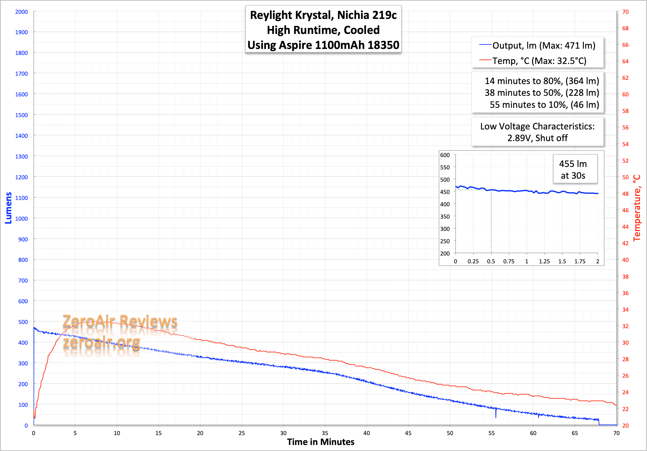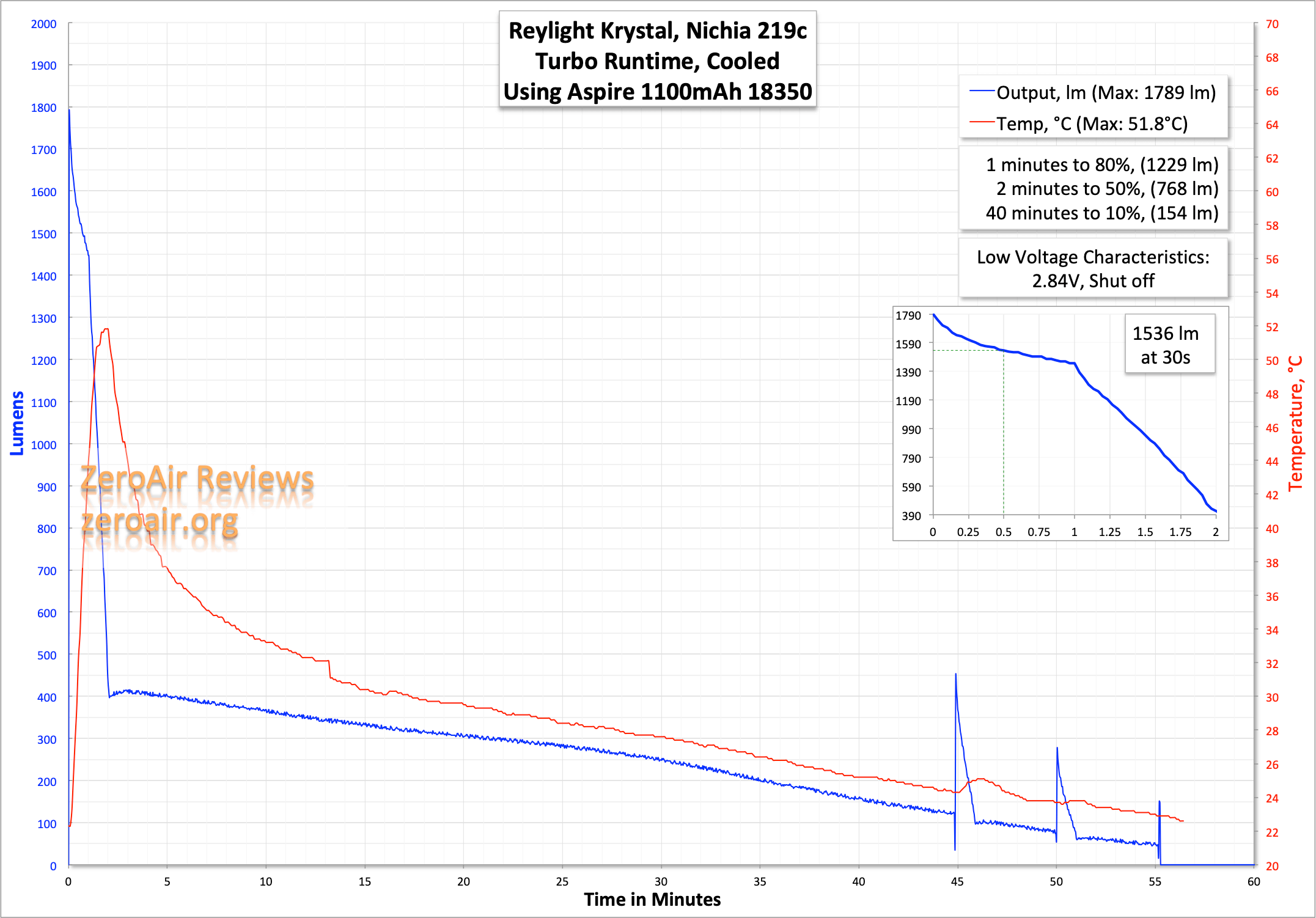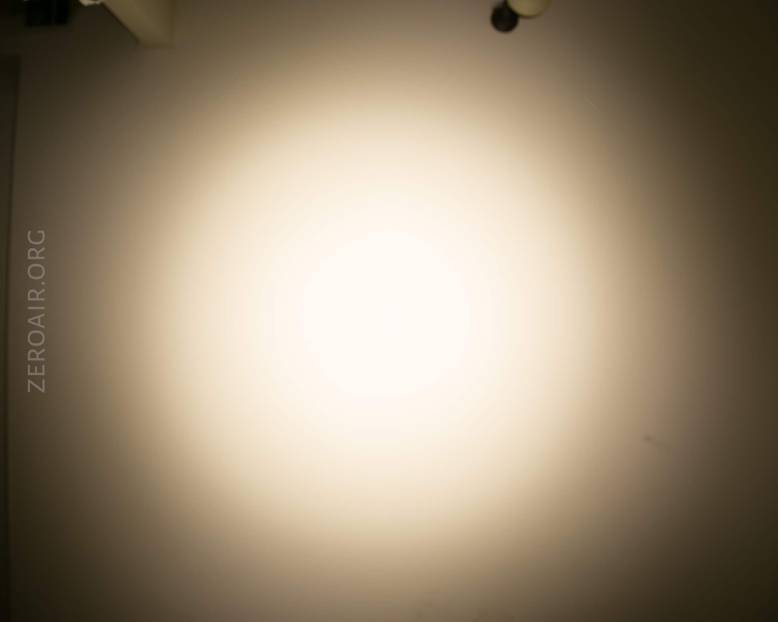 I didn’t use the cell pictured above for testing. I used an Aspire 1100mAh 18350. The output claimed by Reylight is 2500 lumens, and I’m seeing nowhere near that. That’s almost certainly a rating for the 6500K Cree XP-L emitters. No rating was given for the Nichia, which will be lower than the 2500 claimed (and that’s what we see here).
