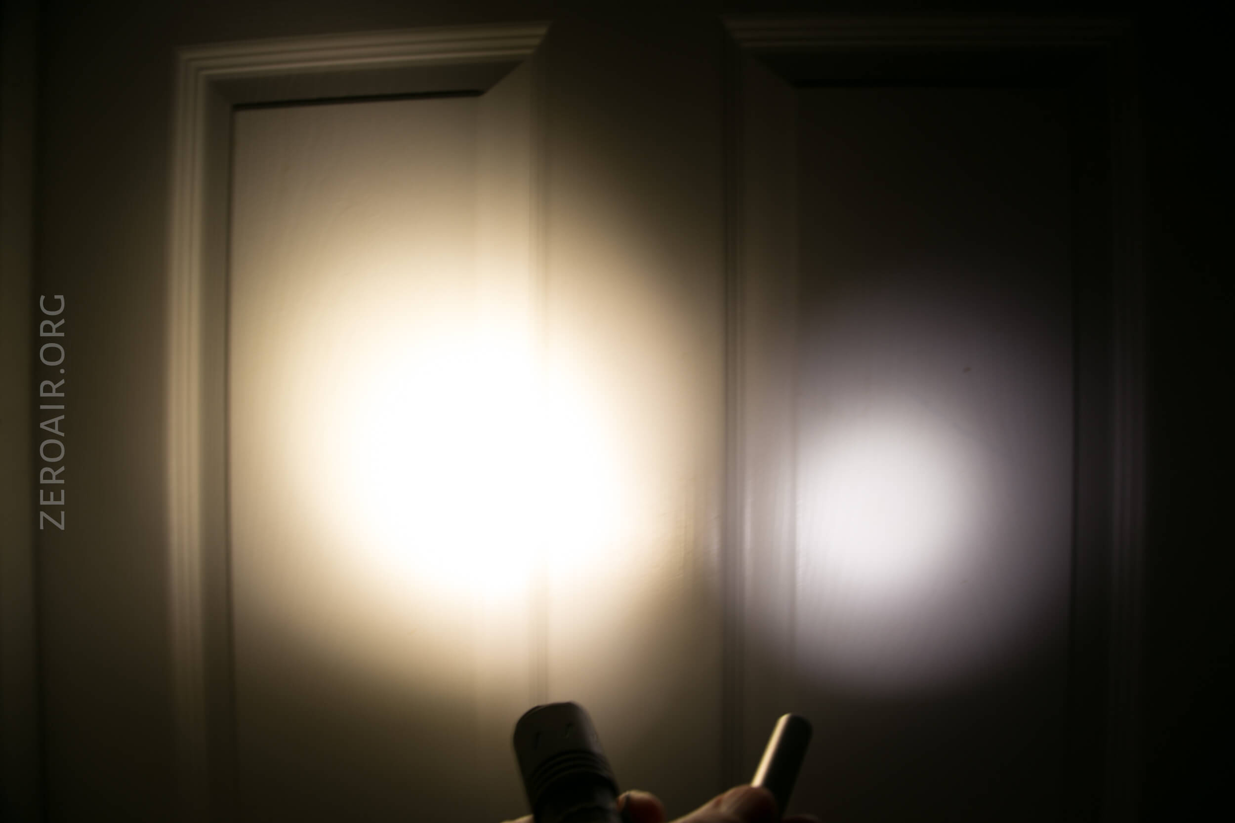 ^ Measurement disclaimer: Testing flashlights is my hobby. I use hobbyist-level equipment for testing, including some I made myself. Try not to get buried in the details of manufacturer specifications versus measurements recorded here; A certain amount of difference (say, 10 or 15%) is perfectly reasonable. Claimed lumens is almost certainly for the XP-L HI version, and at 6500K would likely be much brighter than the Nichia 219c (which is much warmer than 6500K). So don’t worry too much about this percentage.