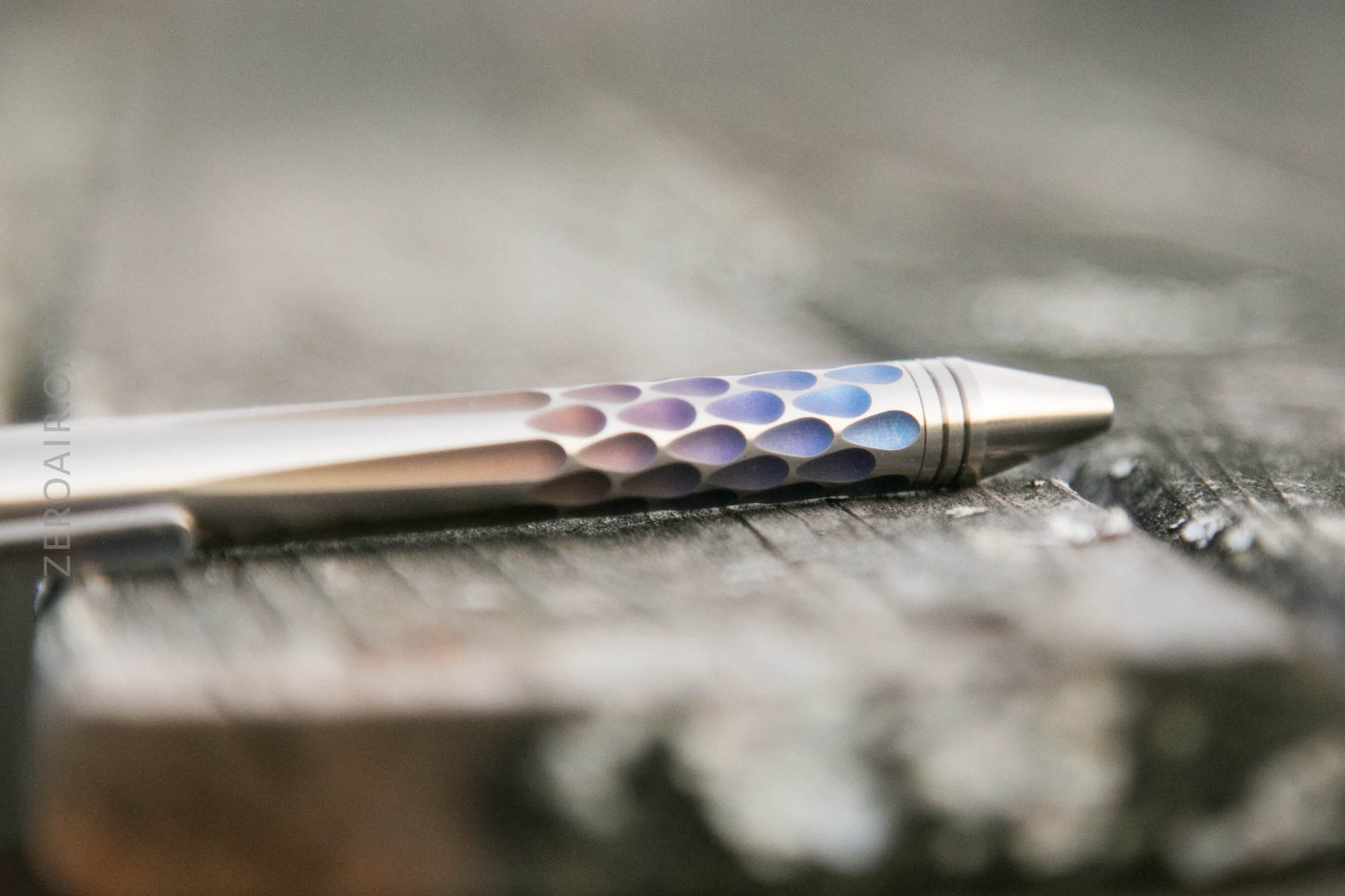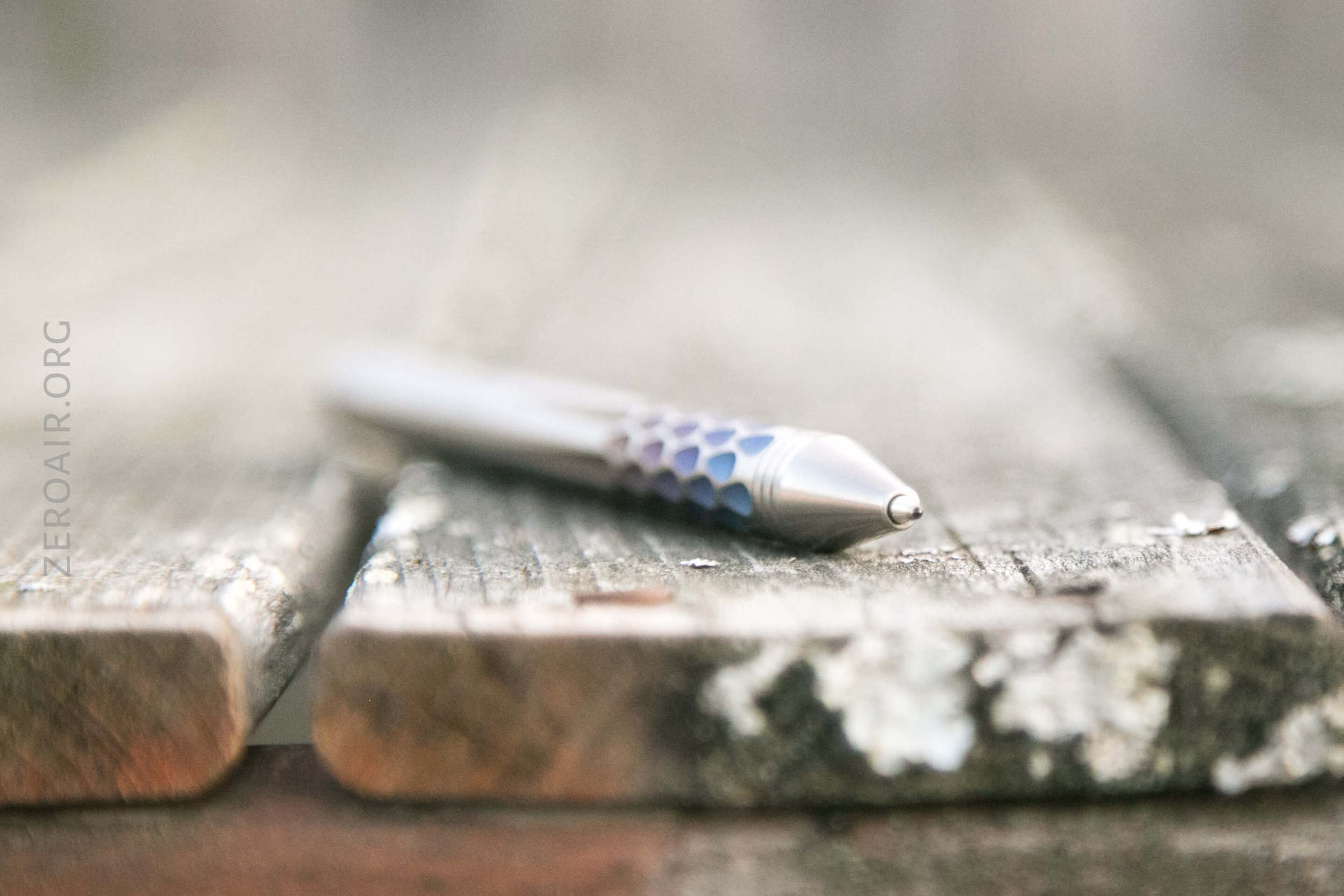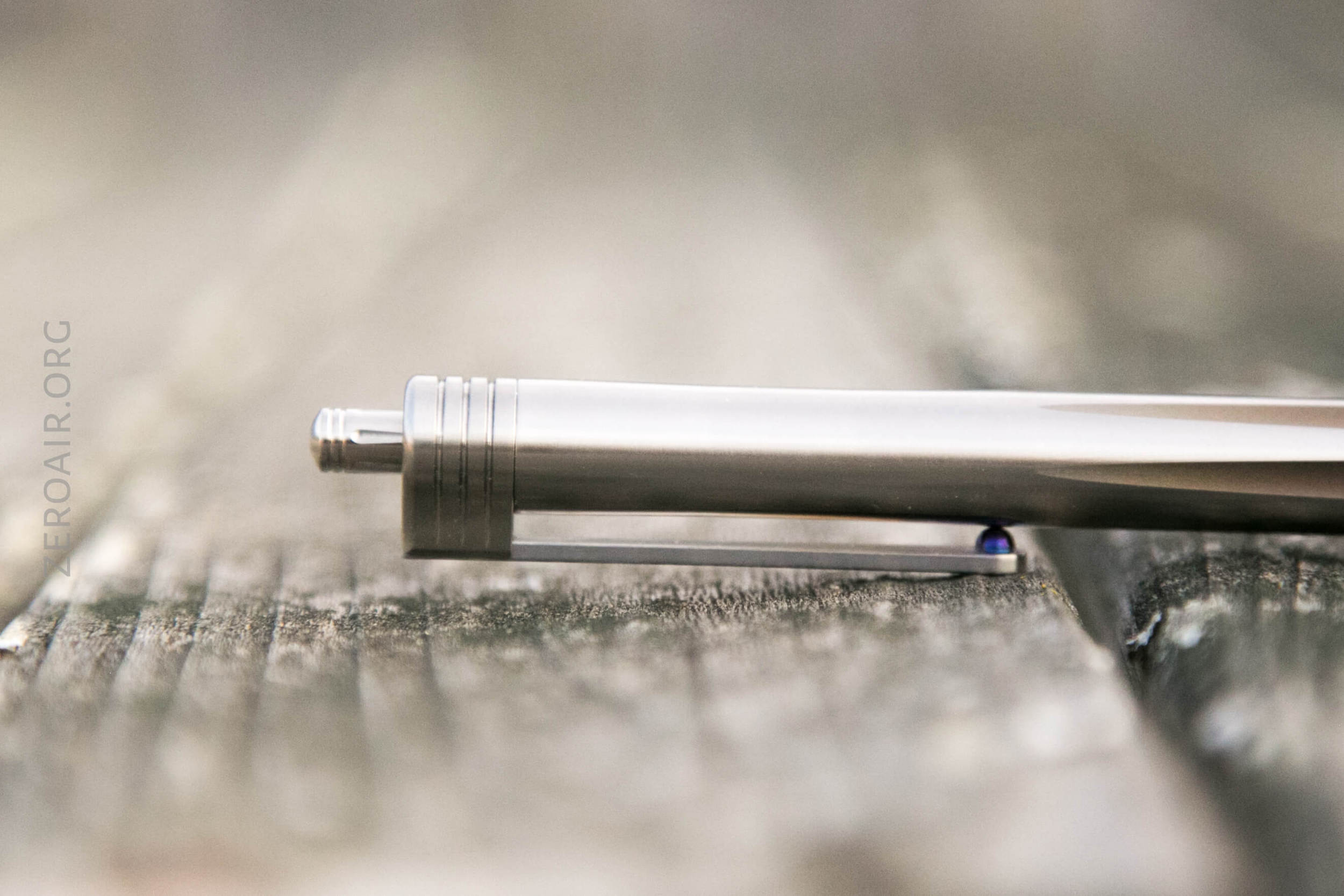 The pen itself in hand feels excellent, too. The titanium tube is more or less glossy (unlike the Thunderstorm), and the teardrops around the grip area mostly just signify where to grasp the pen; they don’t provide much extra grip. That’s not all that unusual in this type of pen. The tip has a couple of rings, but that’s well below where I hold the pen, so they’re not providing grip, either.