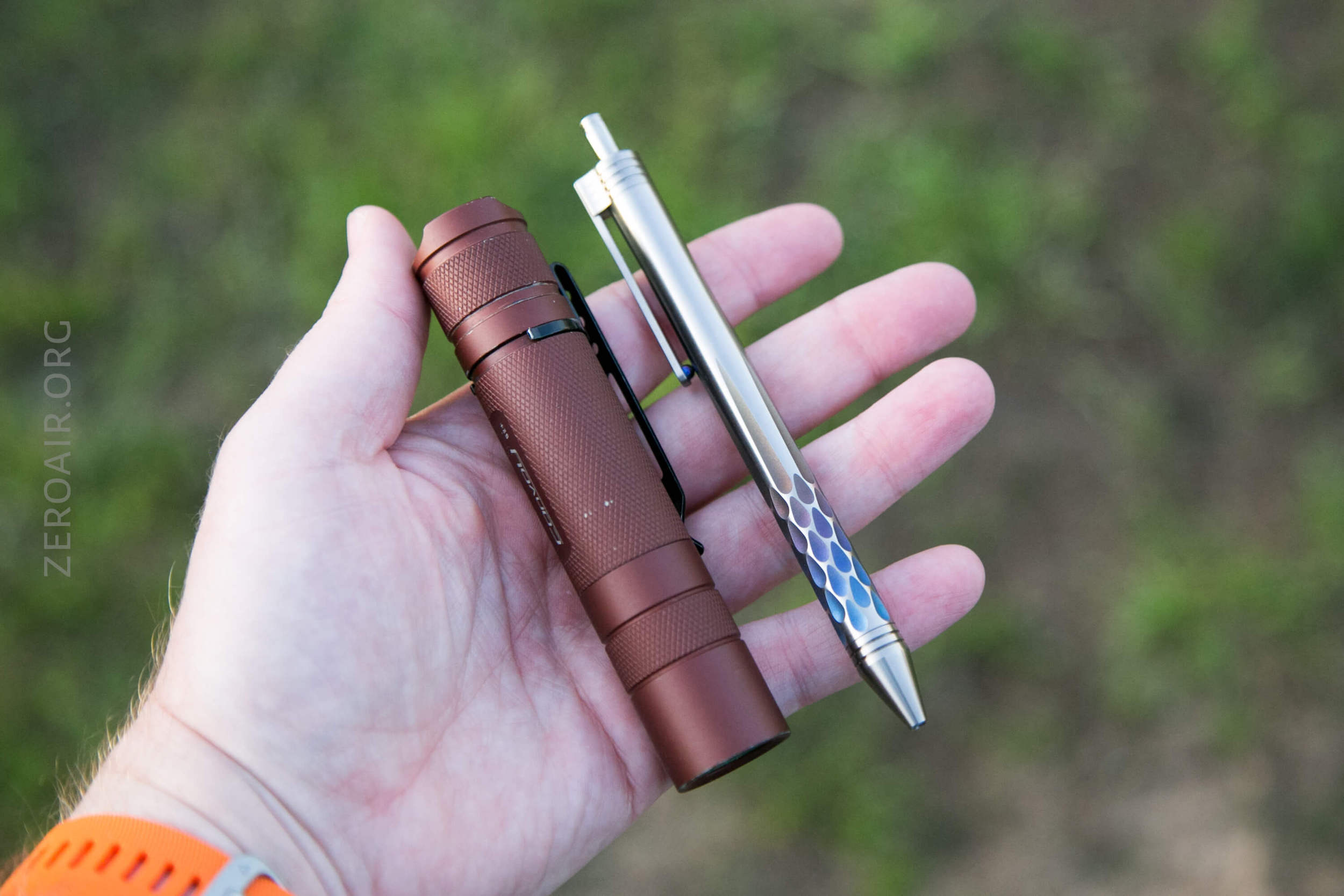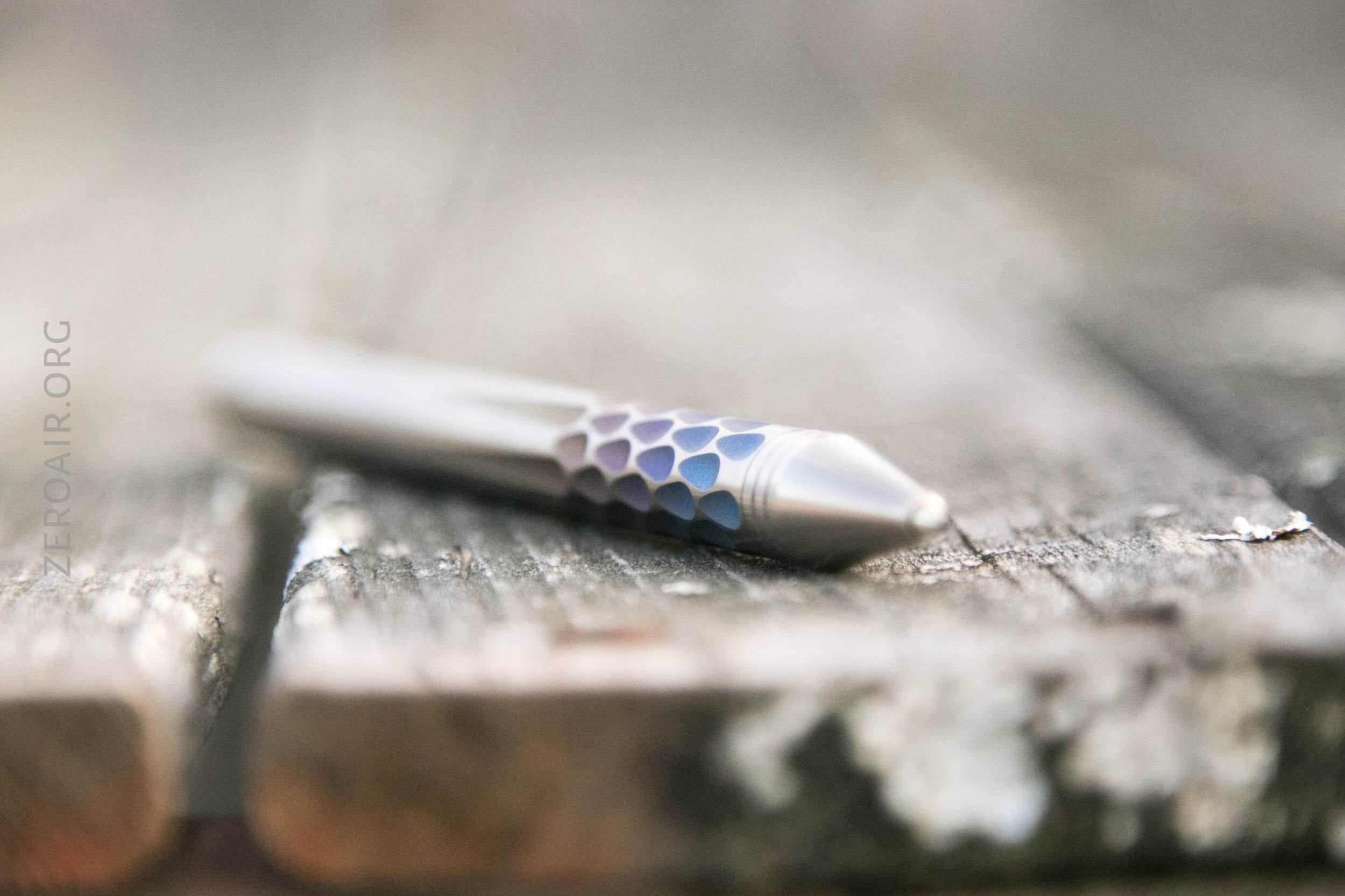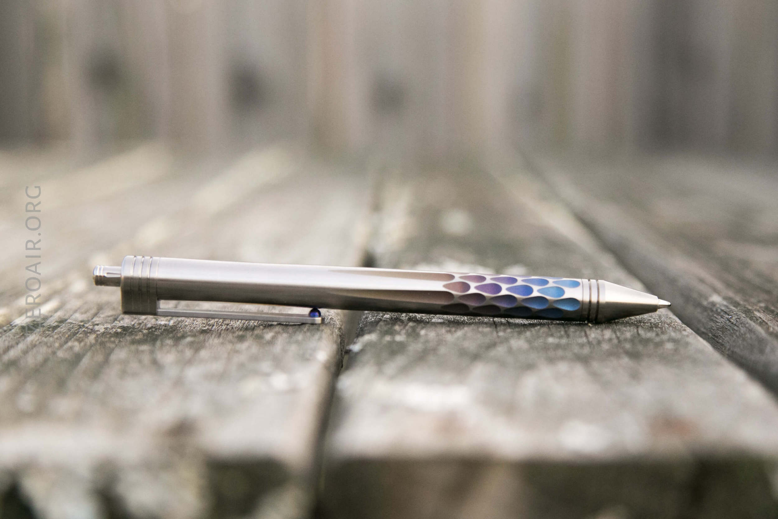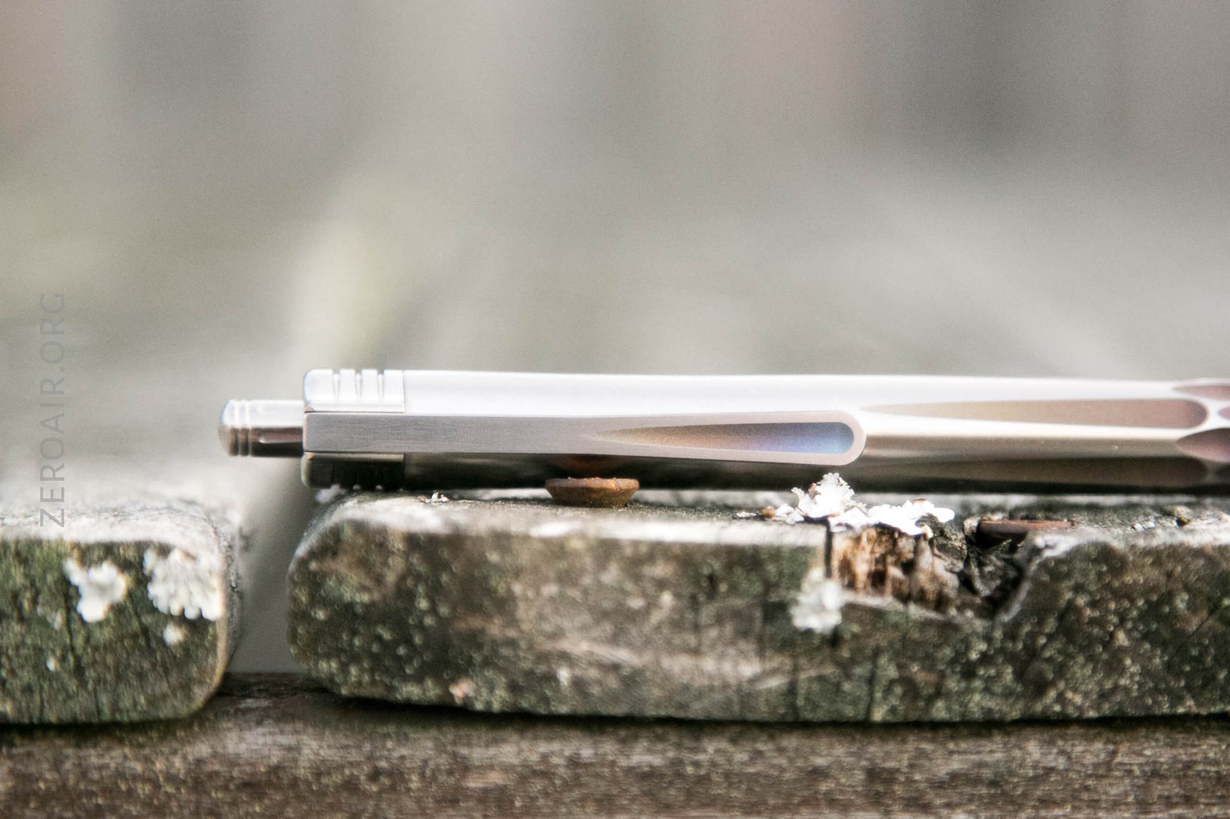The pen itself in hand feels excellent, too. The titanium tube is more or less glossy (unlike the Thunderstorm), and the teardrops around the grip area mostly just signify where to grasp the pen; they don’t provide much extra grip. That’s not all that unusual in this type of pen. The tip has a couple of rings, but that’s well below where I hold the pen, so they’re not providing grip, either.