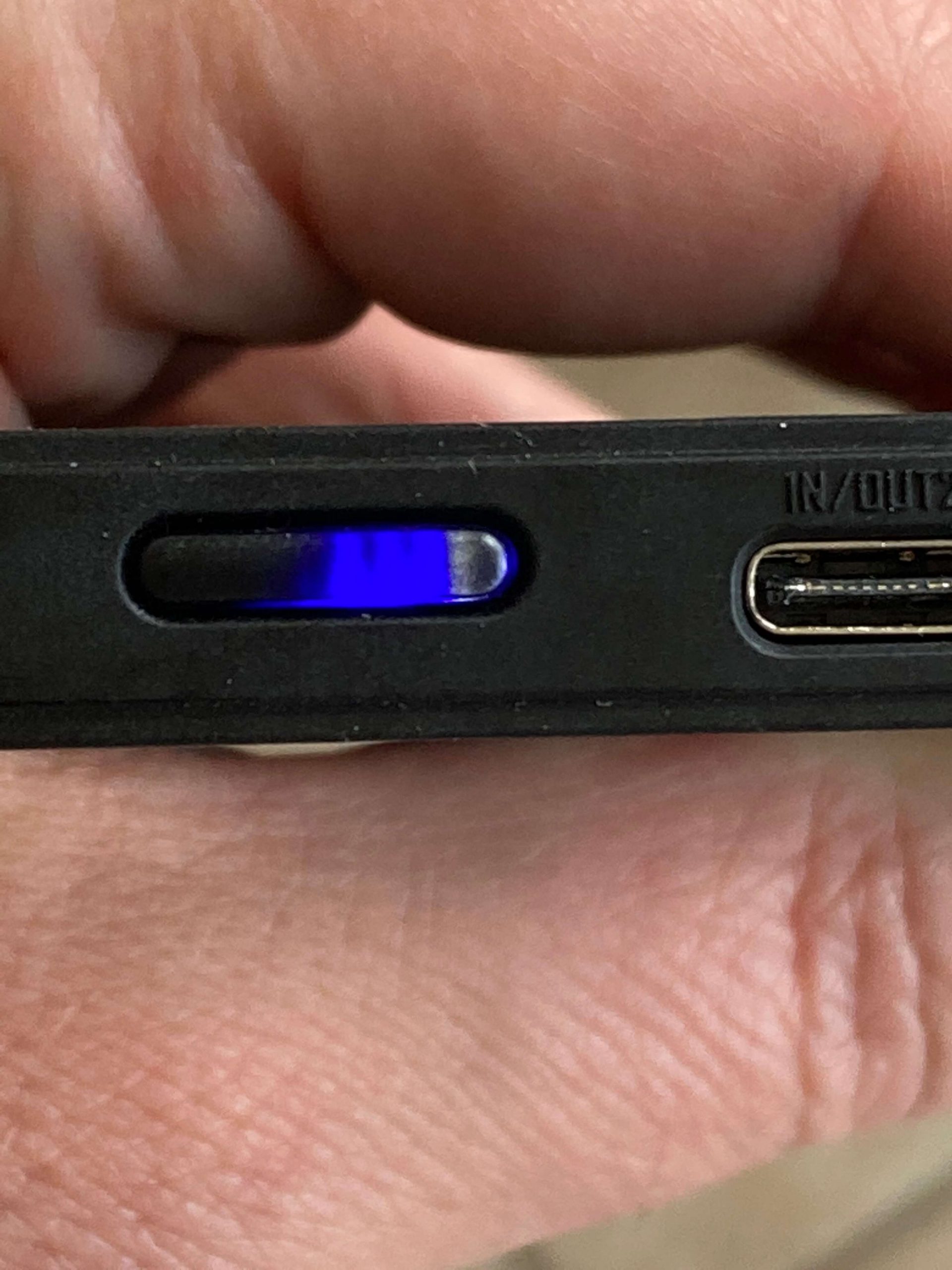 Clicking the button also displays the charge level of the NB10000. There are actually four indicators, with one being dedicated to being white for Low Current Mode. The other three are blue. Here’s how they display charge level.