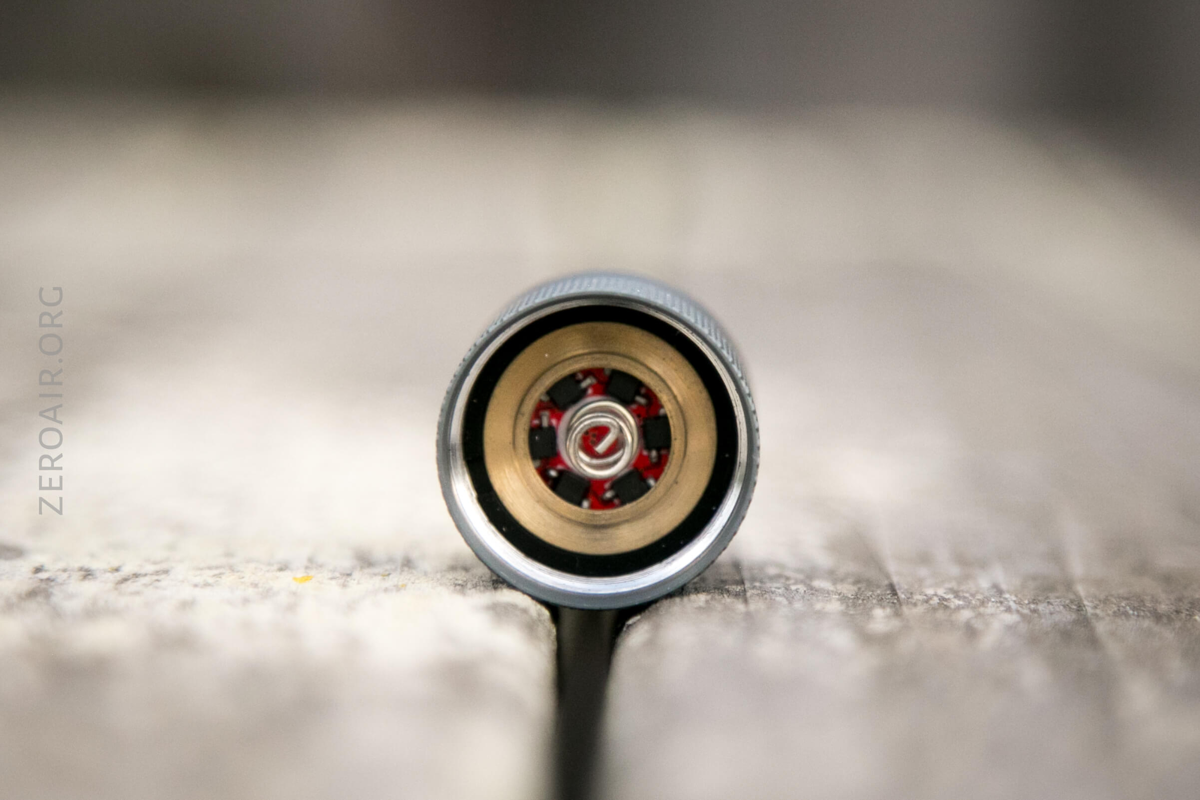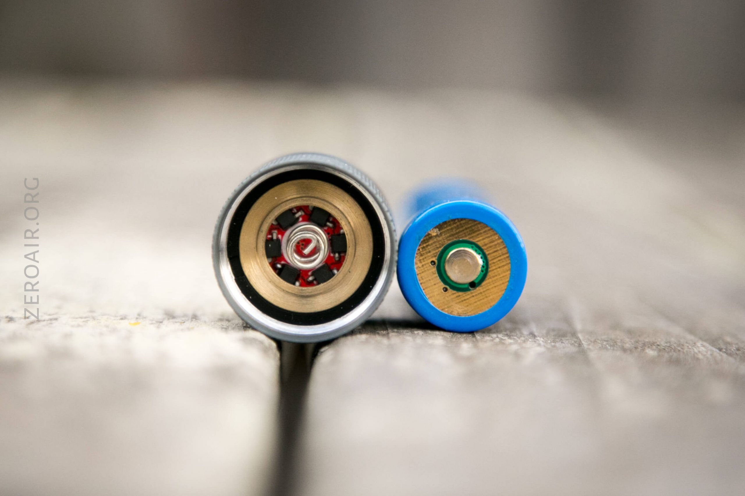 The FW3E is powered by a lithium-ion cell, 18650-sized. The light will ship with a cell because the cell it uses is proprietary. That’s going to be a massive downside for many users (including me), but it answers some important issues that the FW series lights have had. Namely, the positive terminal is a normal button (ish) top, but it’s surrounded by an exposed negative contact. That negative contact connects with the lip on the brass ring in the head, seen at left below.