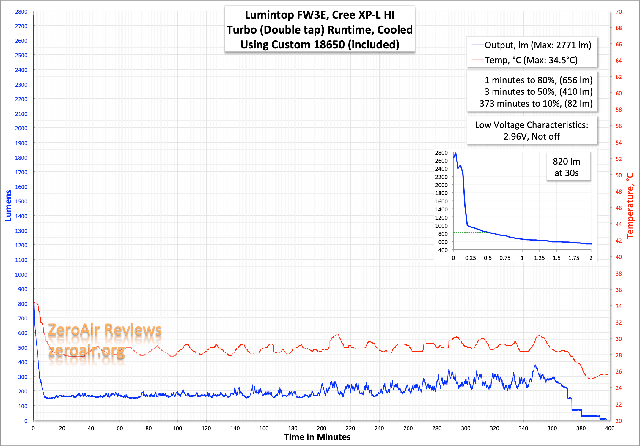 Here’s a runtime on turbo, where “Turbo” means turning the light on and double-clicking (the highest possible output). The stepdown is very fast, and thus a 30-second reading shows only 820 lumen output. 2800 lumen initial output is respectable (but also essentially not a meaningful number).