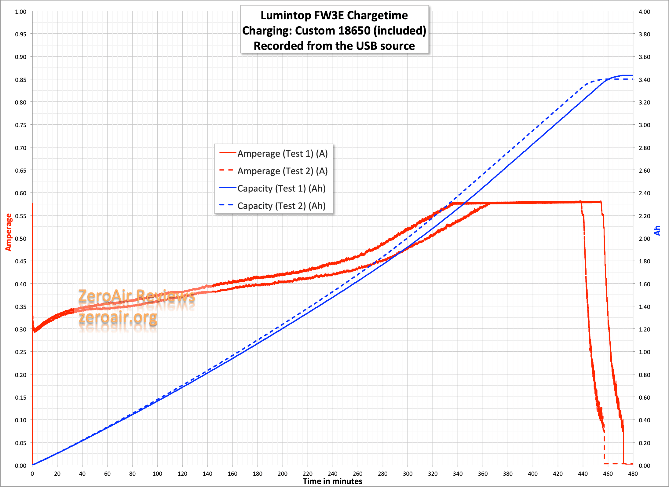 The charge circuit on the cell charges as follows. The charge rate is surprisingly slow, even for micro-USB, at well under 0.5A for most of the charge time. Thus, the full charge takes around 8 hours.